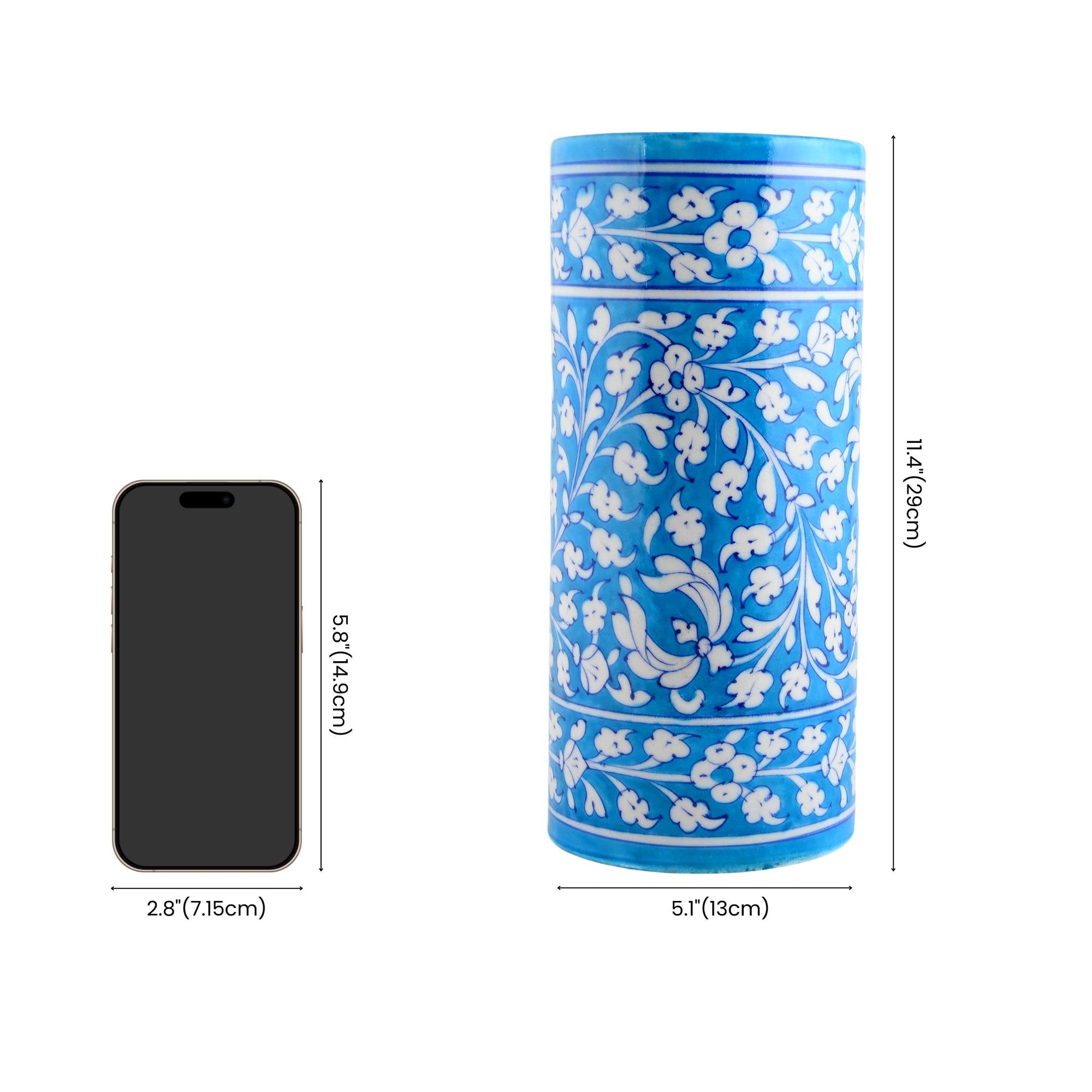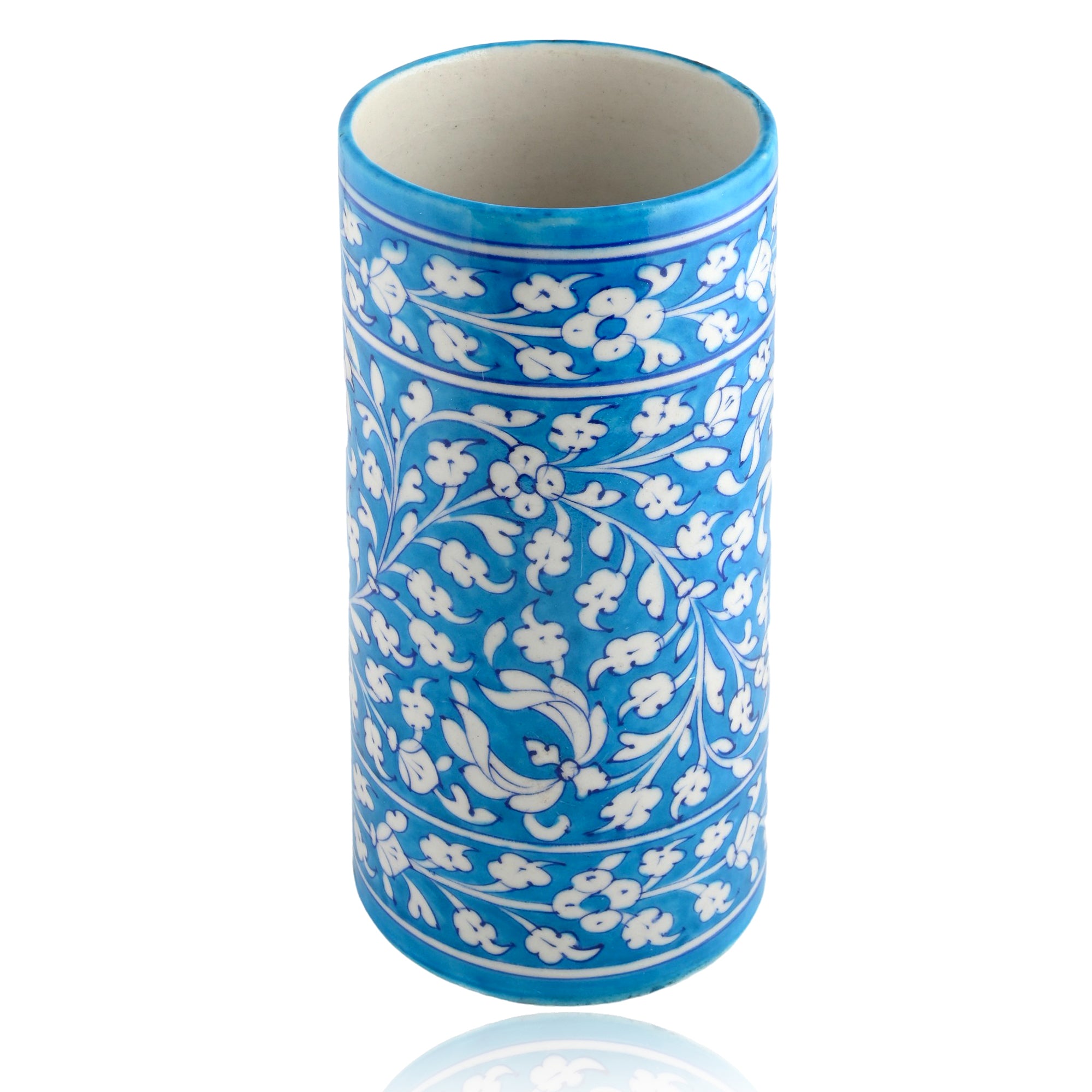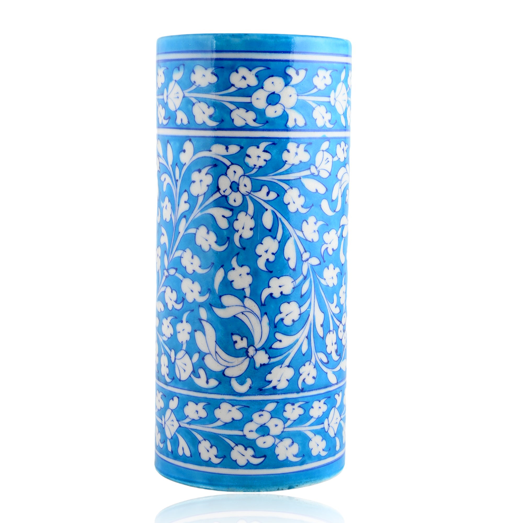 Blue Pottery Art—Handcrafted and hand-painted by skilled artisans. Floral pattern decorative cylindrical vase—Cyan Blue. Ideal for home décor. Perfect and thoughtful gifting.
