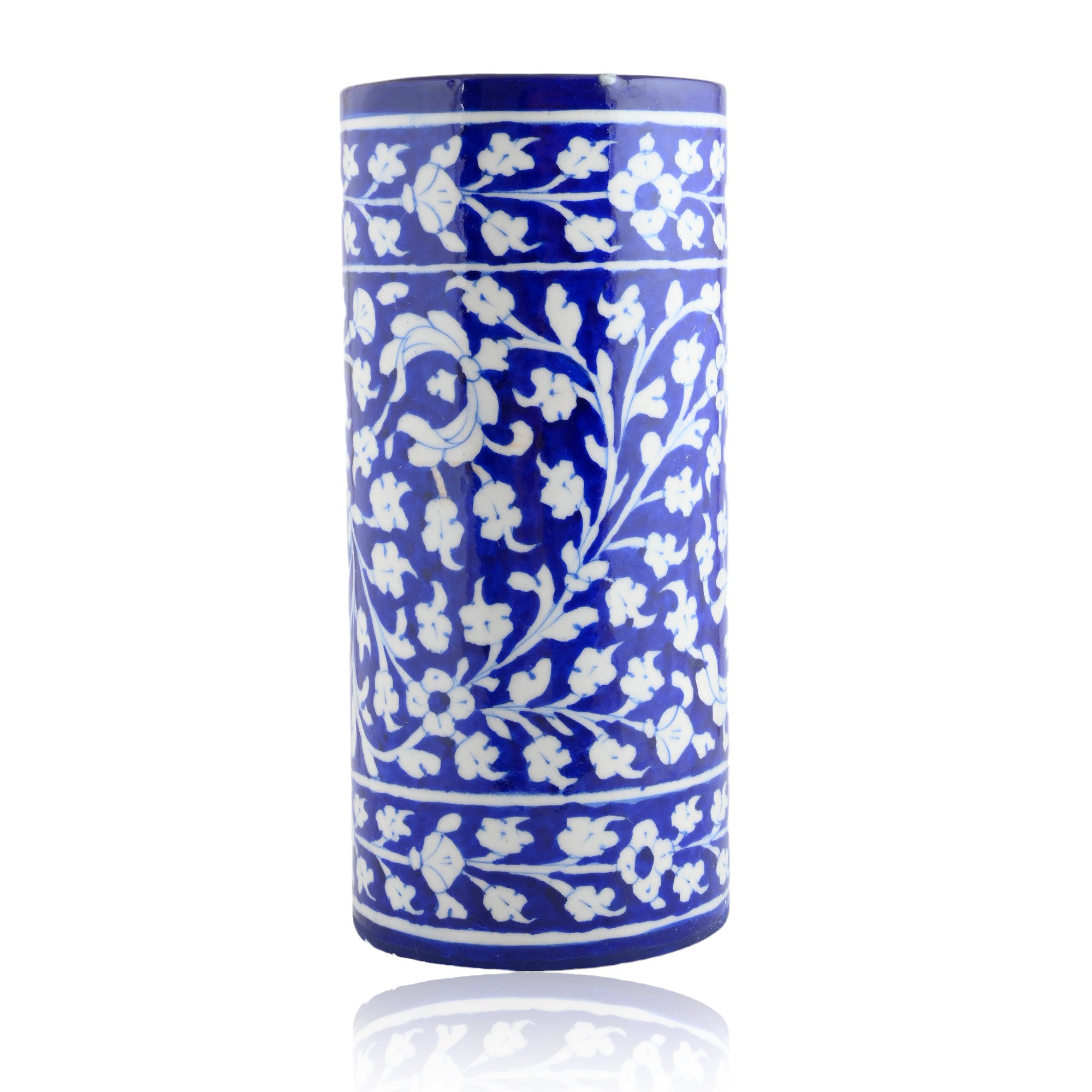 Blue Pottery Art—Handcrafted and hand-painted by skilled artisans. Floral pattern decorative cylindrical vase—Royal Blue. Ideal for home décor. Perfect and thoughtful gifting.