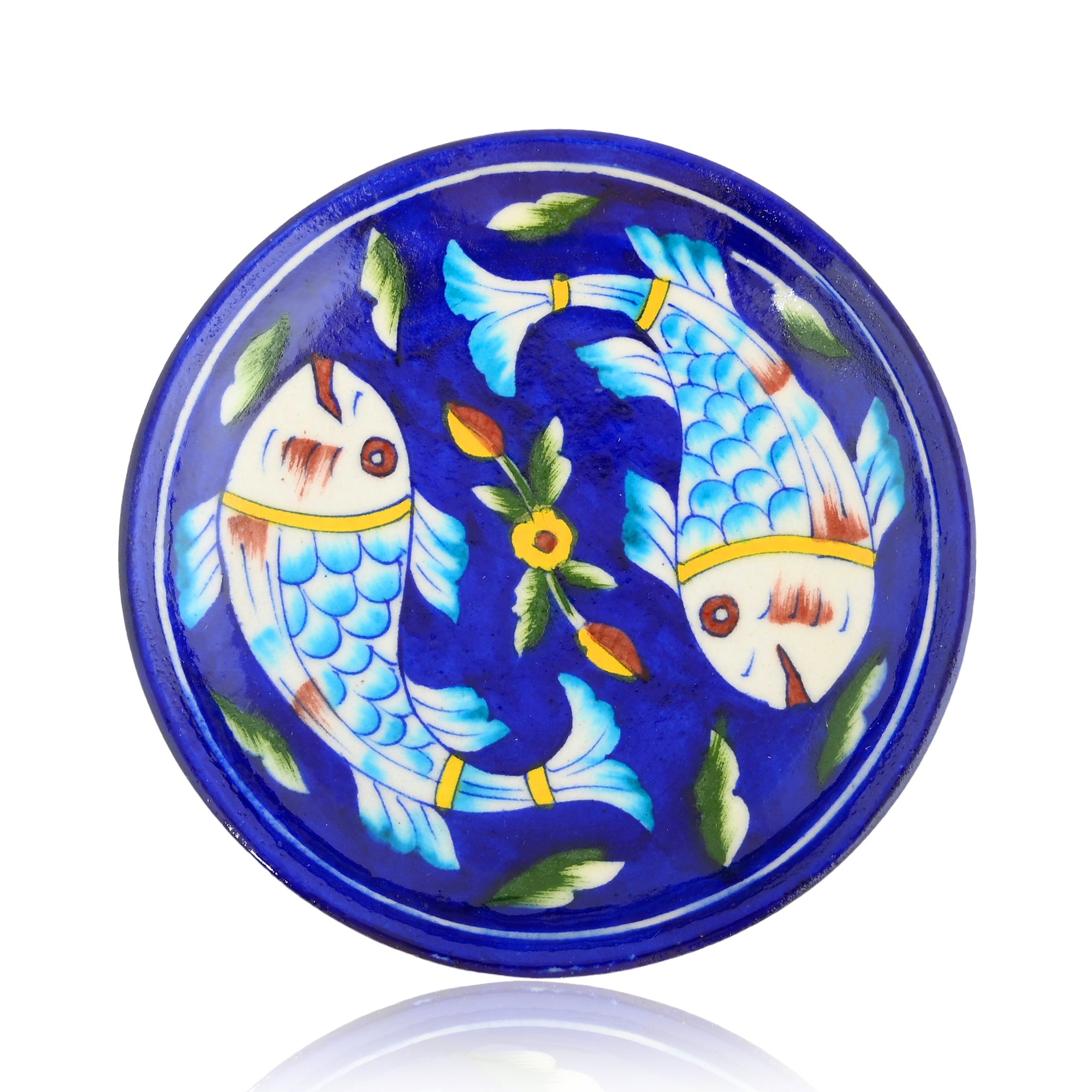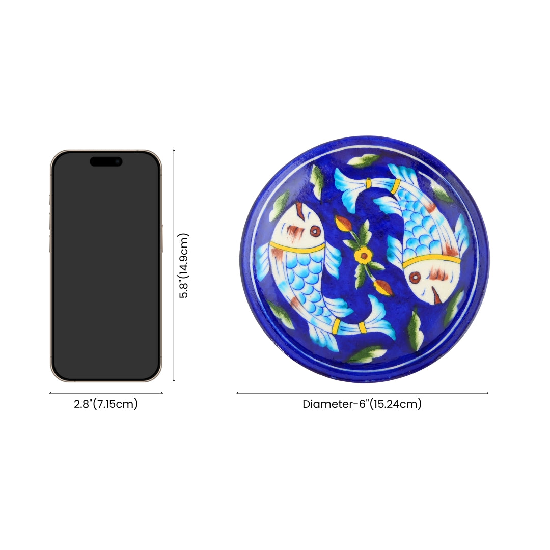 Blue Pottery Art—Handcrafted and hand-painted by skilled artisans. Fish pattern decorative plate—Blue. Ideal for kitchen décor and wall décor. Perfect and thoughtful gifting.