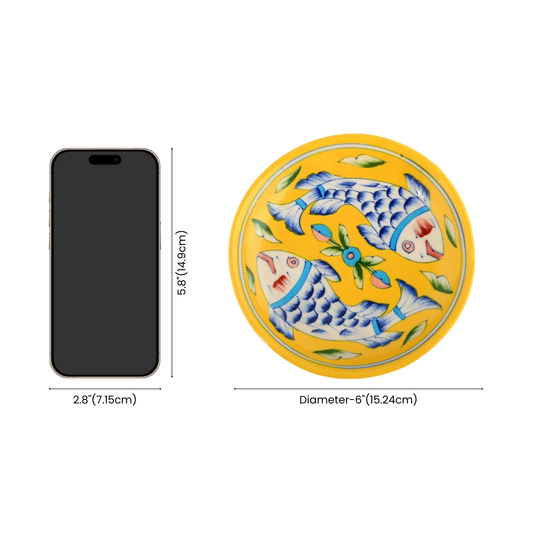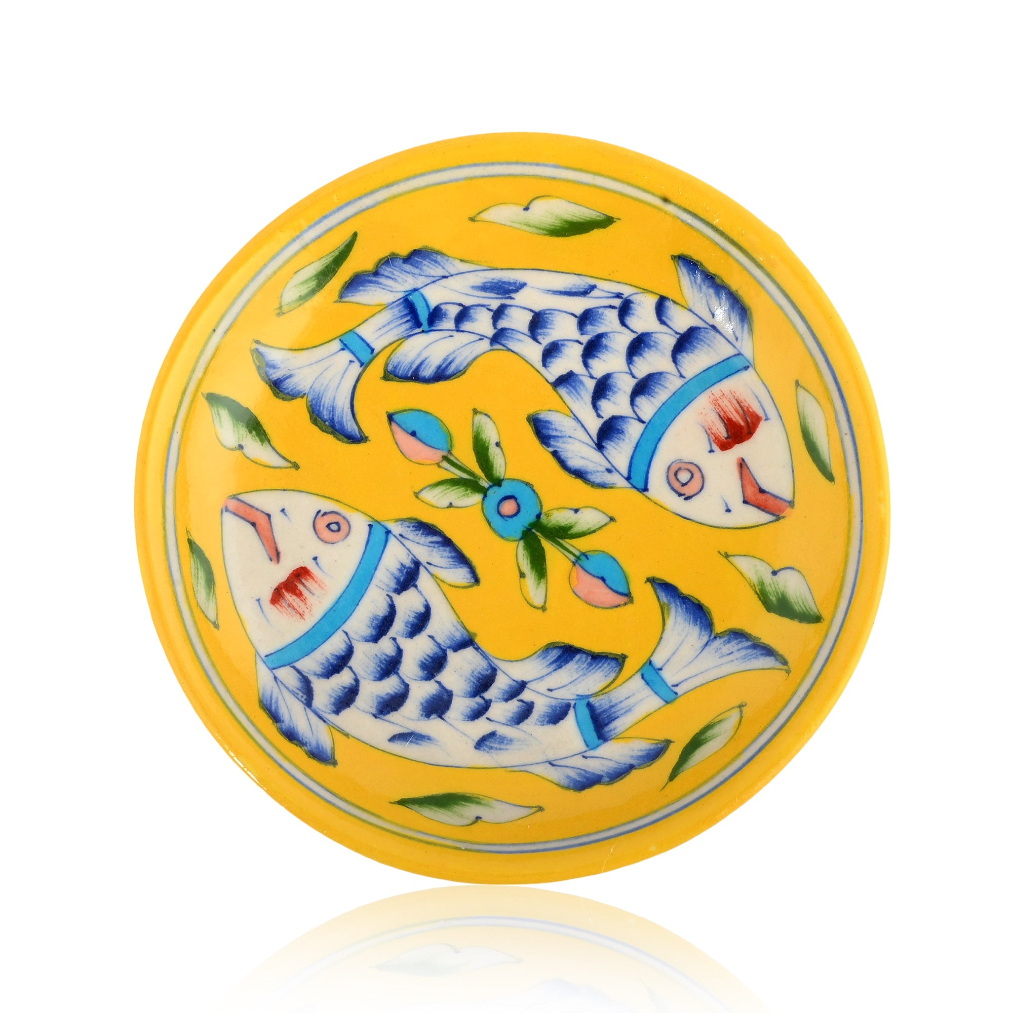 Blue Pottery Art—Handcrafted and hand-painted by skilled artisans. Fish pattern decorative plate—Yellow. Ideal for kitchen décor and wall décor. Perfect and thoughtful gifting.