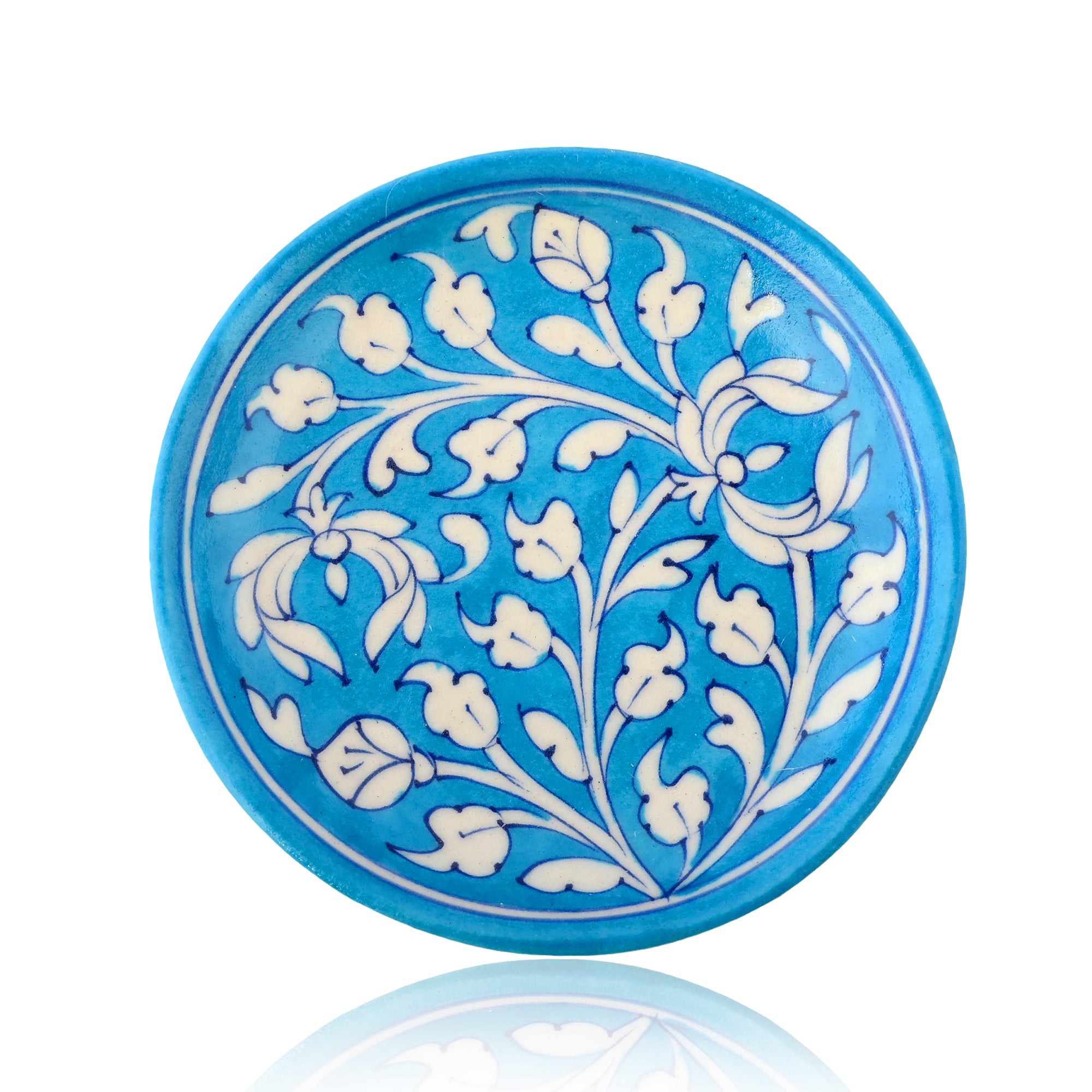 Blue Pottery Art—Handcrafted and hand-painted by skilled artisans.Floral pattern decorative plate—Cyan Blue.Ideal for kitchen décor and wall décor.Perfect and thoughtful gifting.