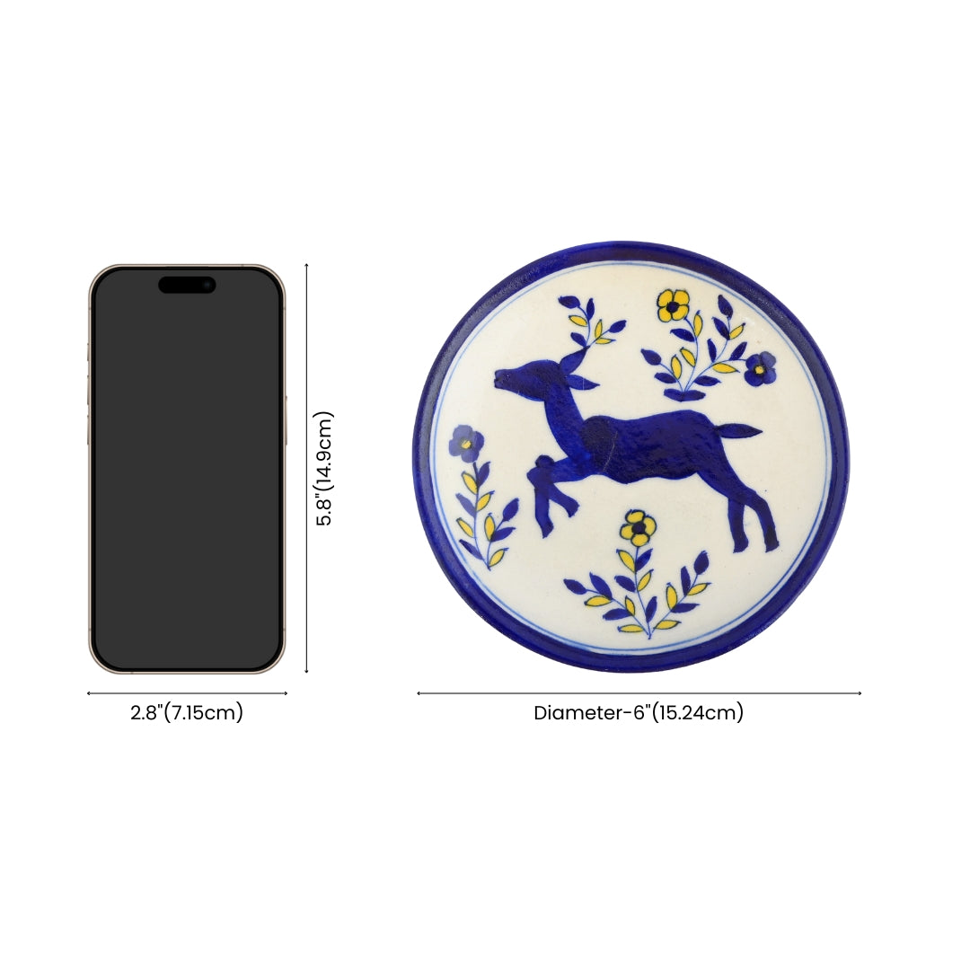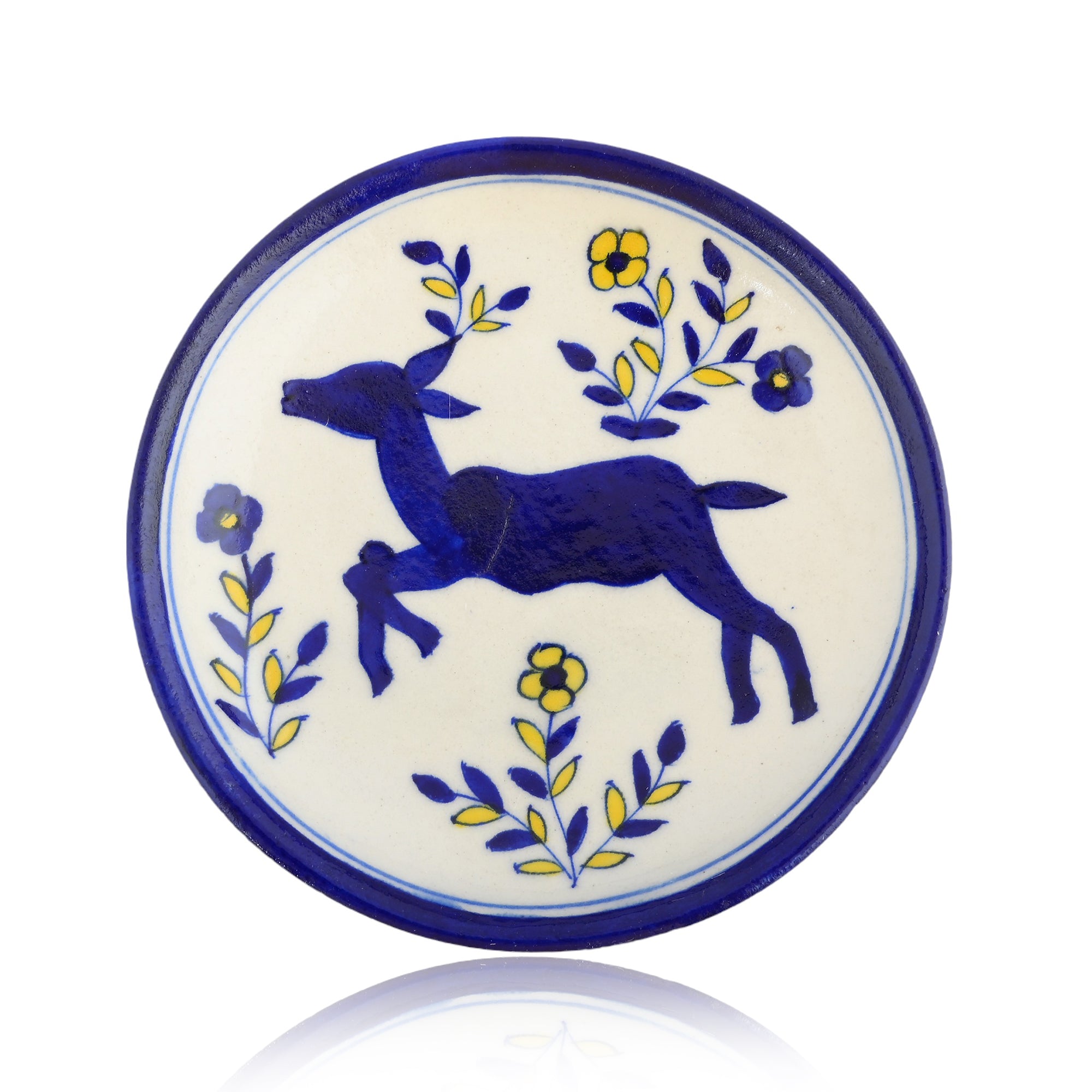 Blue Pottery Art—Handcrafted and hand-painted by skilled artisans. Deer pattern decorative plate—White and Blue. Ideal for kitchen décor and wall décor. Perfect and thoughtful gifting.