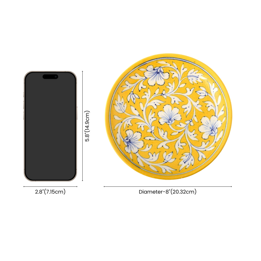 Blue Pottery Art—Handcrafted and hand-painted by skilled artisans. Floral pattern decorative plate—Yellow. Ideal for kitchen décor and wall décor. Perfect and thoughtful gifting.