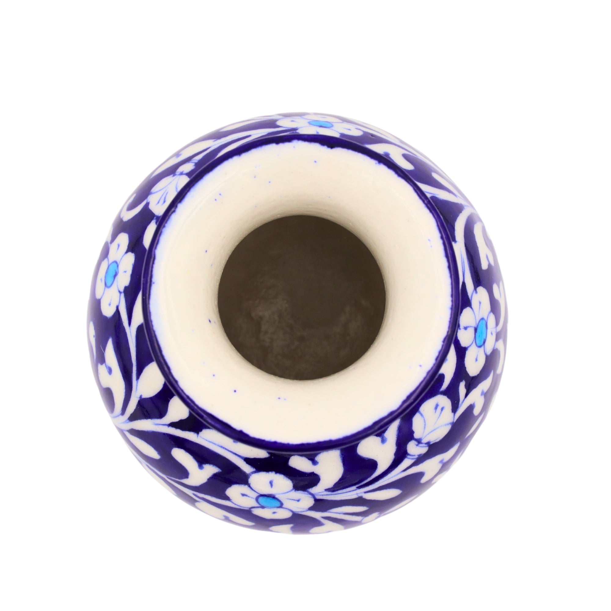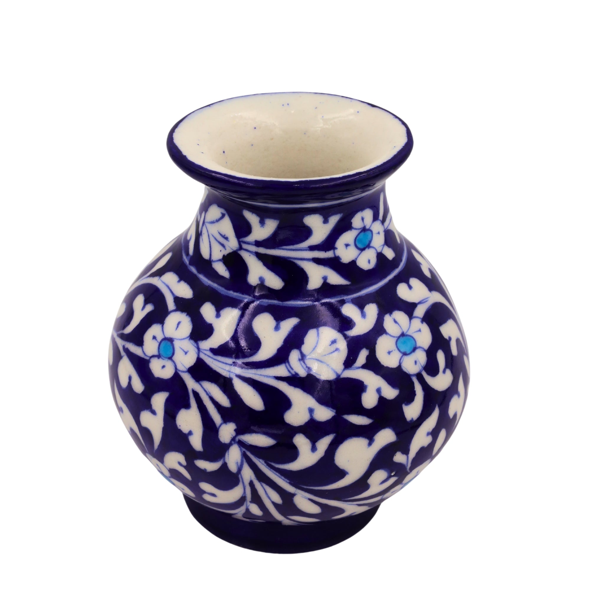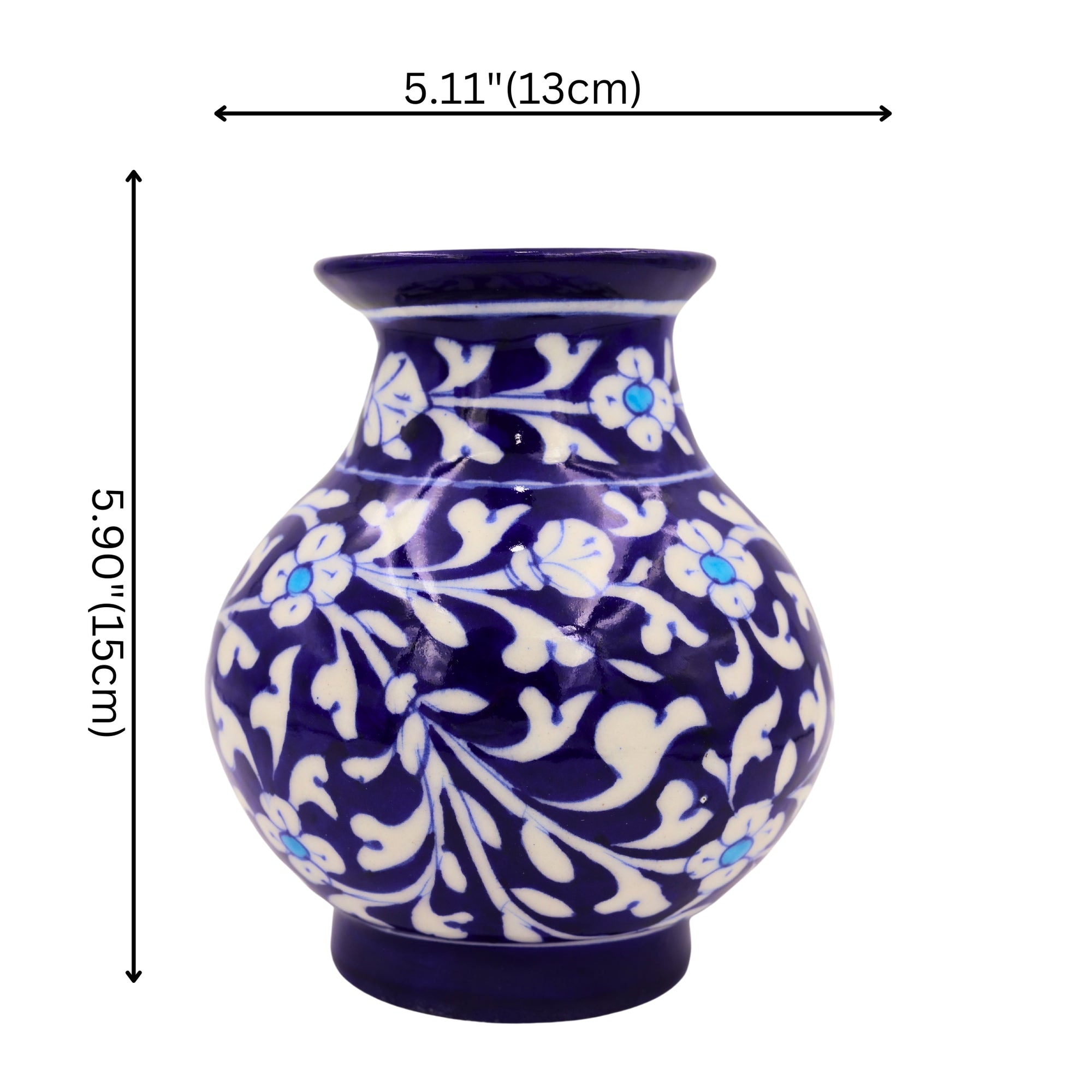 Enhance your home with our stunning hand-painted blue pottery vase from Jaipur, India. This masterpiece showcases intricate white floral designs on a Cobalt Blue base, blending classic and contemporary styles.