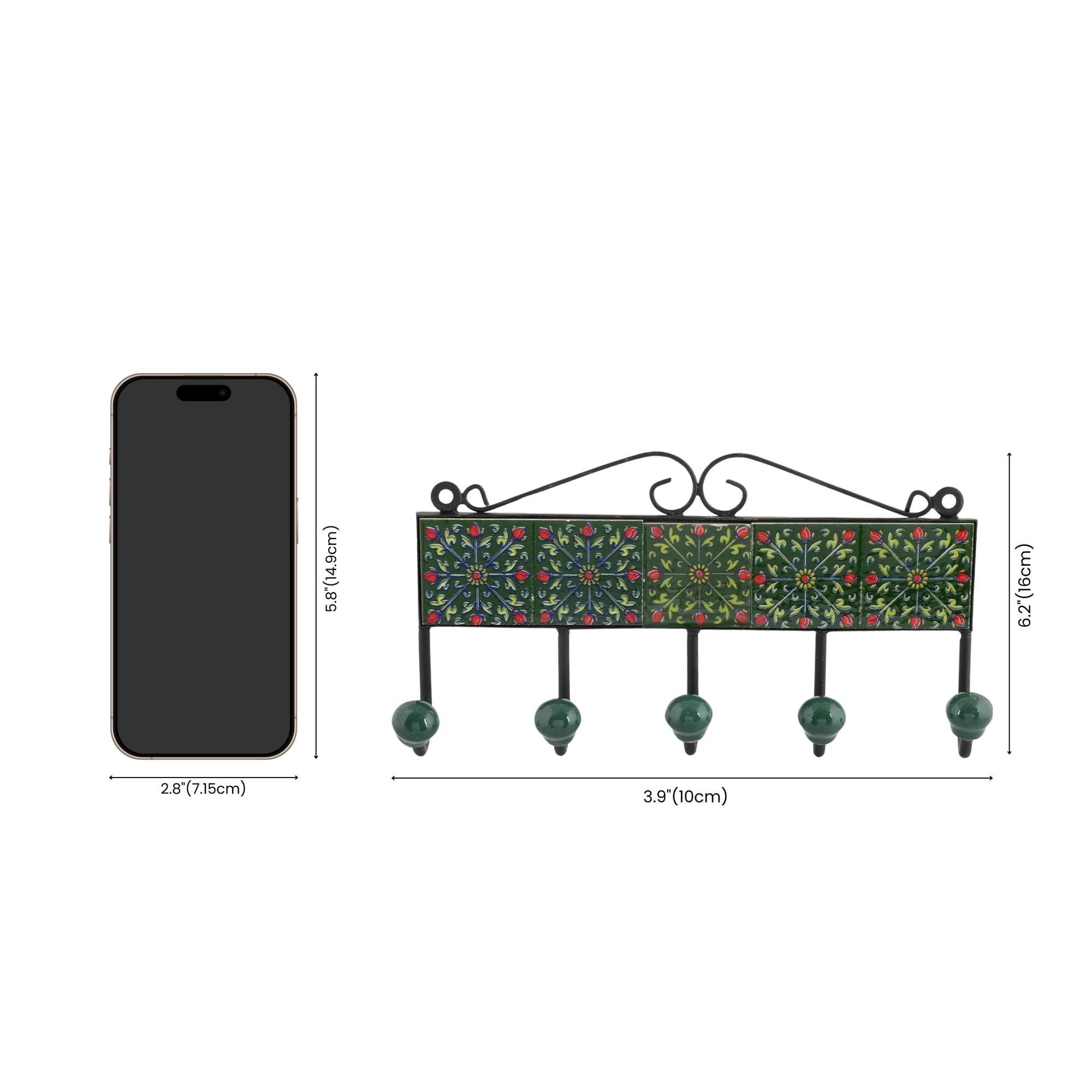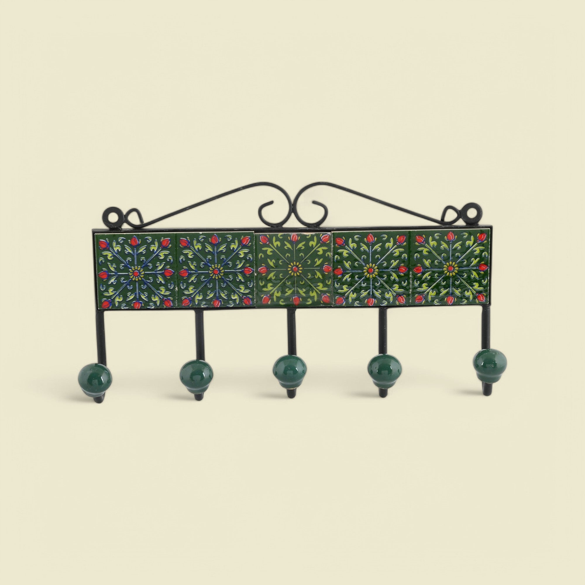 Blue Pottery Inspired Decorative Key Holder—Green—5 Hooks