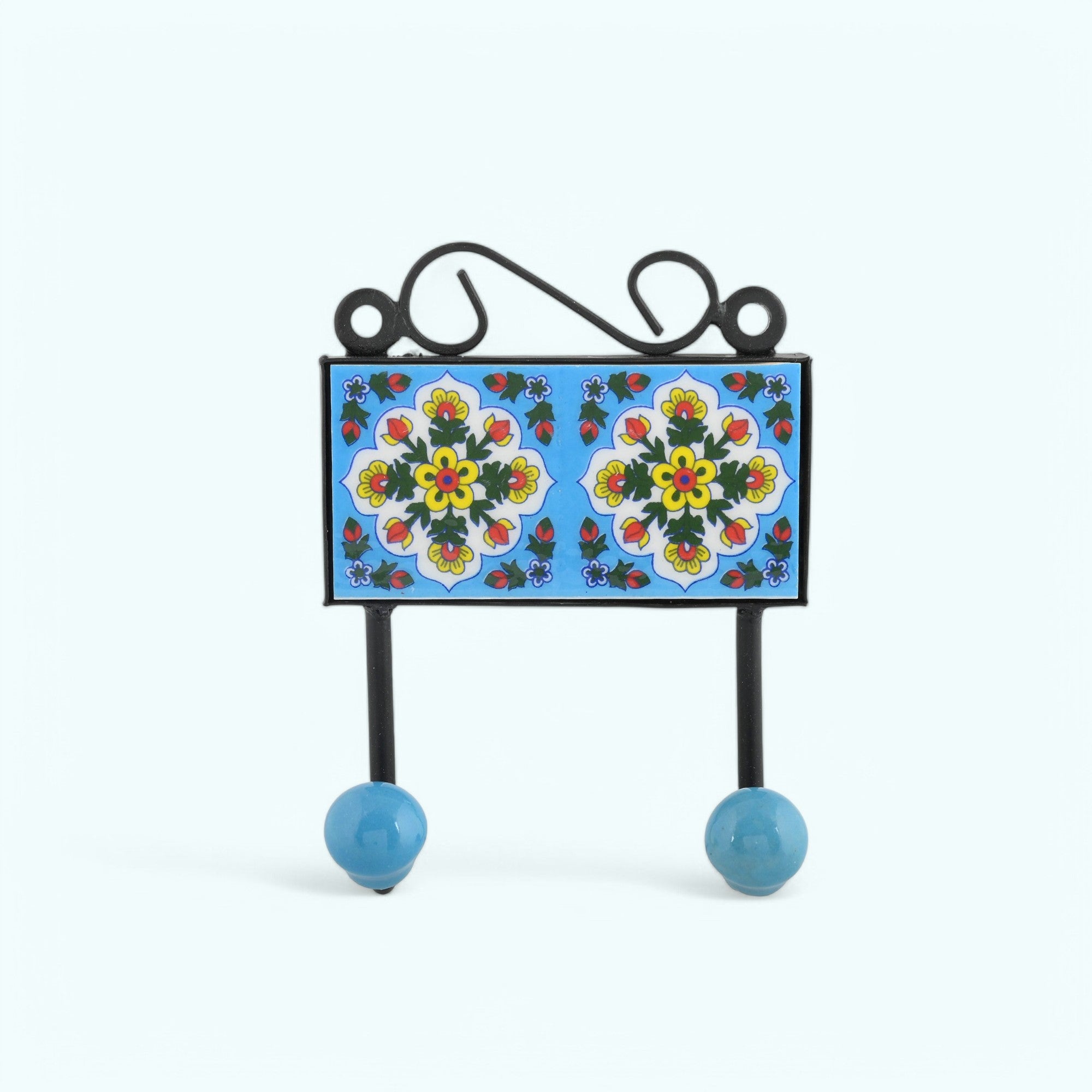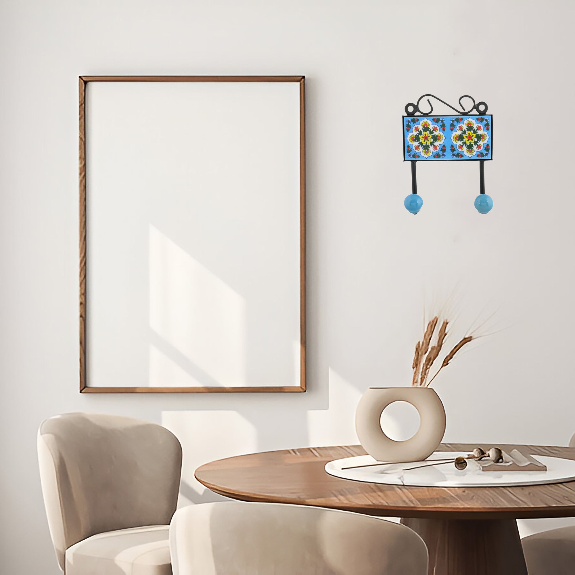 Blue Pottery Inspired Decorative Key Holder—Turquoise—2 Hooks-2