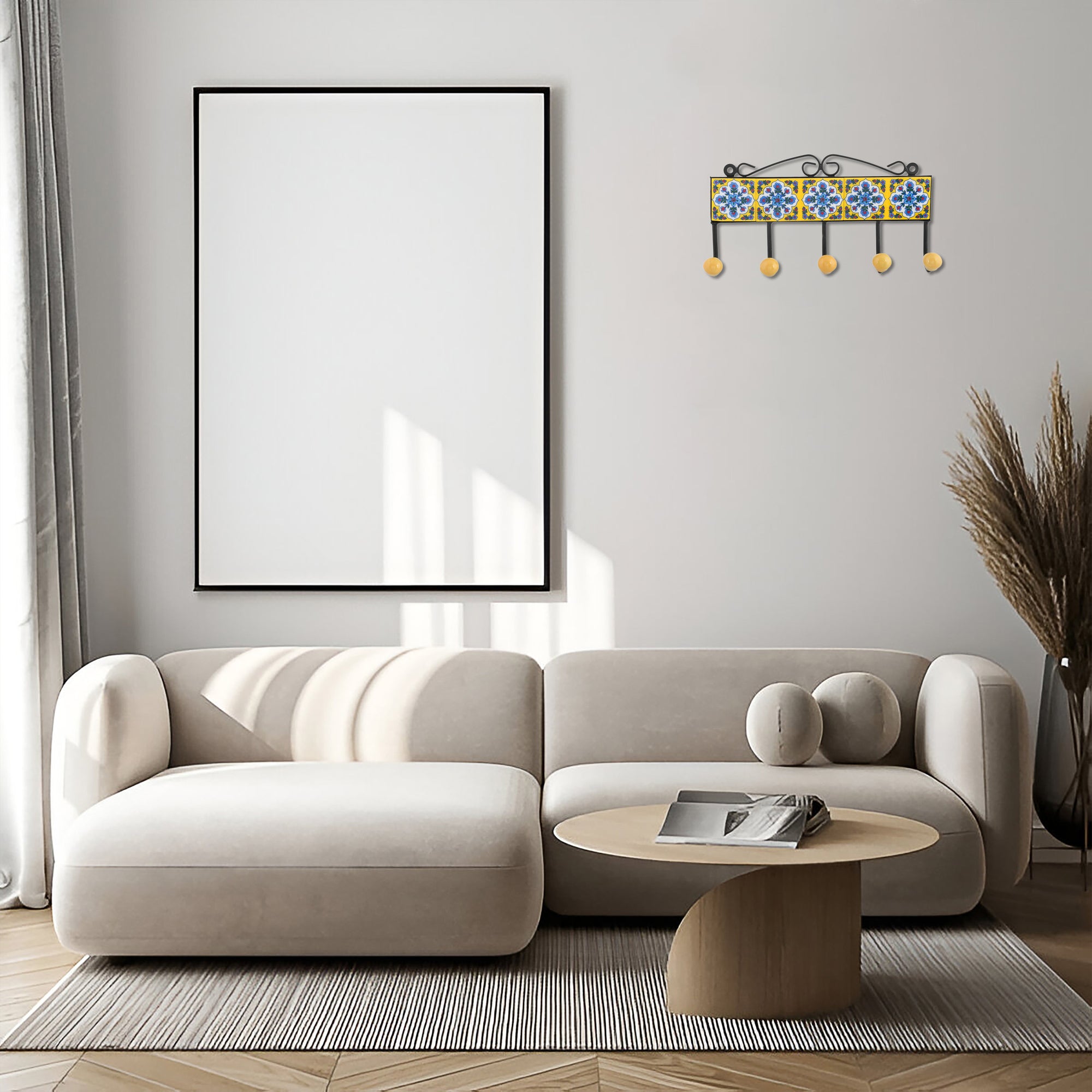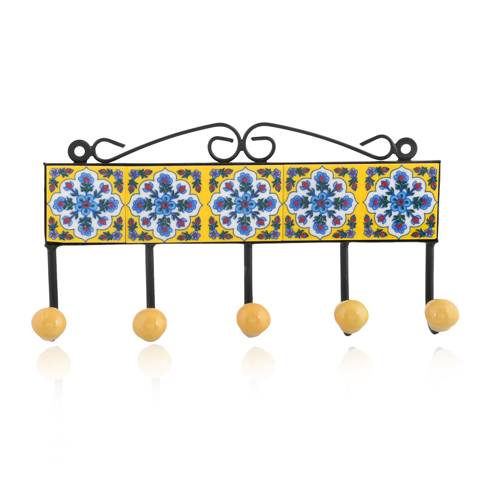 Blue Pottery Inspired Decorative Key Holder—Yellow—5 Hooks