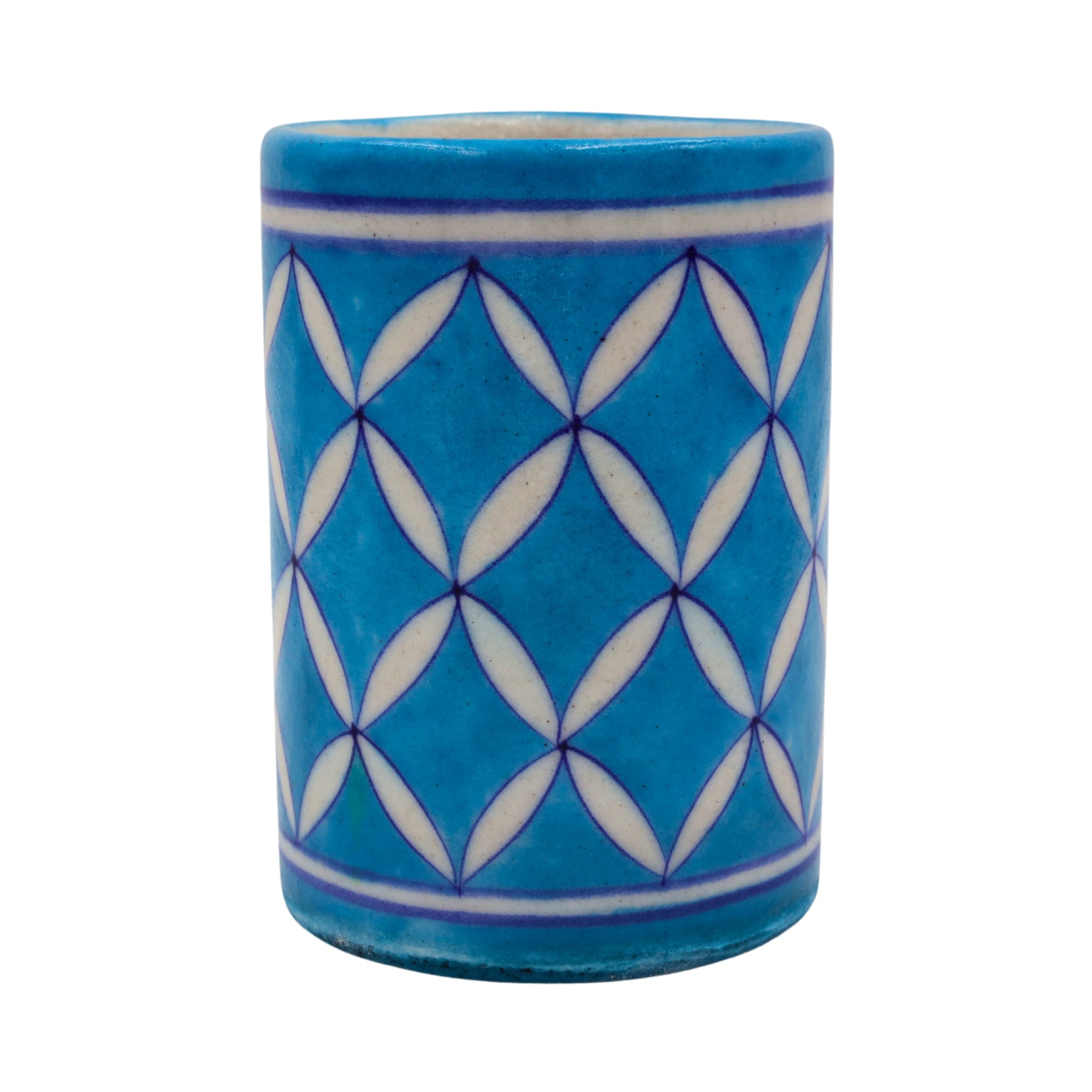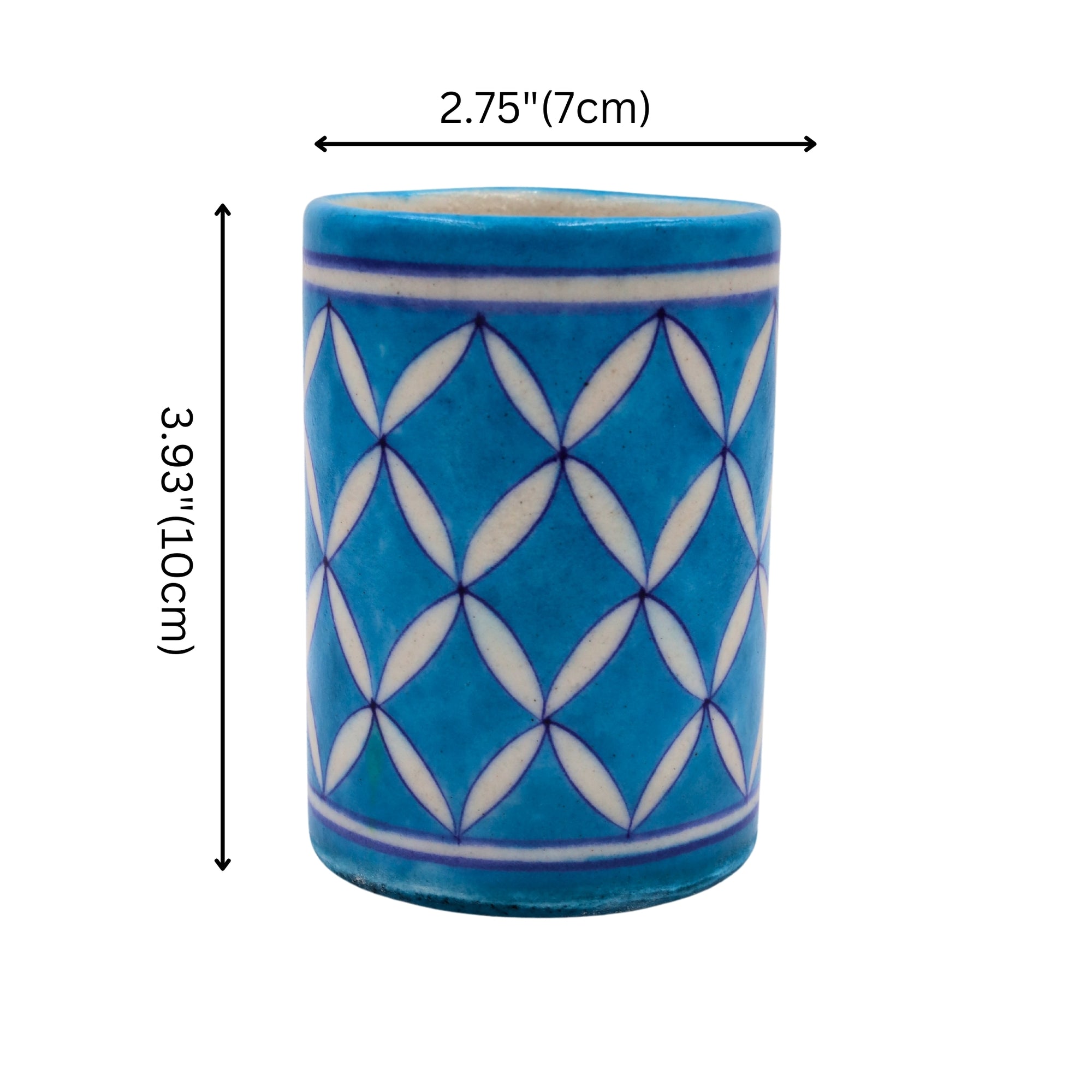 Experience the magic of India with our Blue Pottery turquoise Color Pen Holder. This exquisite piece depicts intricate craftsmanship, showcasing the rich heritage of Indian artistry. This elegant turquoise base, adorned with detailed white Lattice patterns, adds a captivating charm to any space. Embrace the allure of this handcrafted masterpiece to elevate your home with elegance and sophistication.