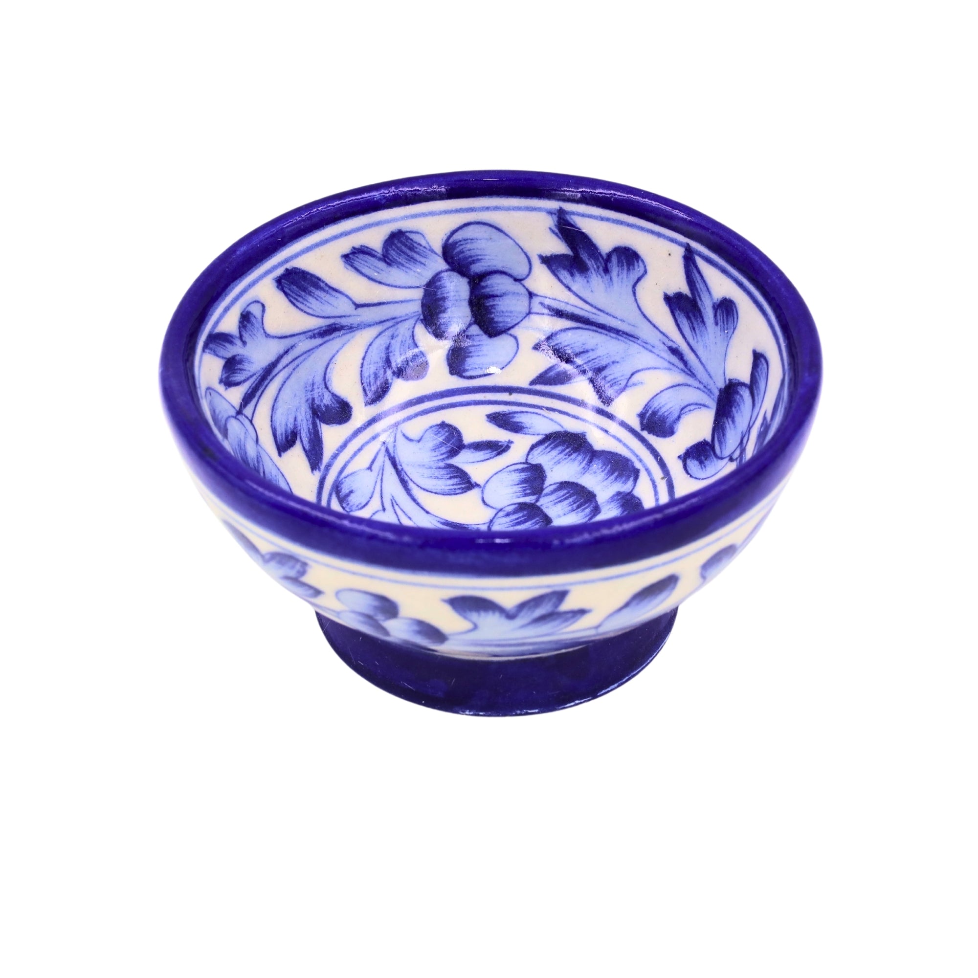 Round blue pottery bowl in white and blue. Handcrafted in our Jaipur workshop. Classic palette, lead-free.