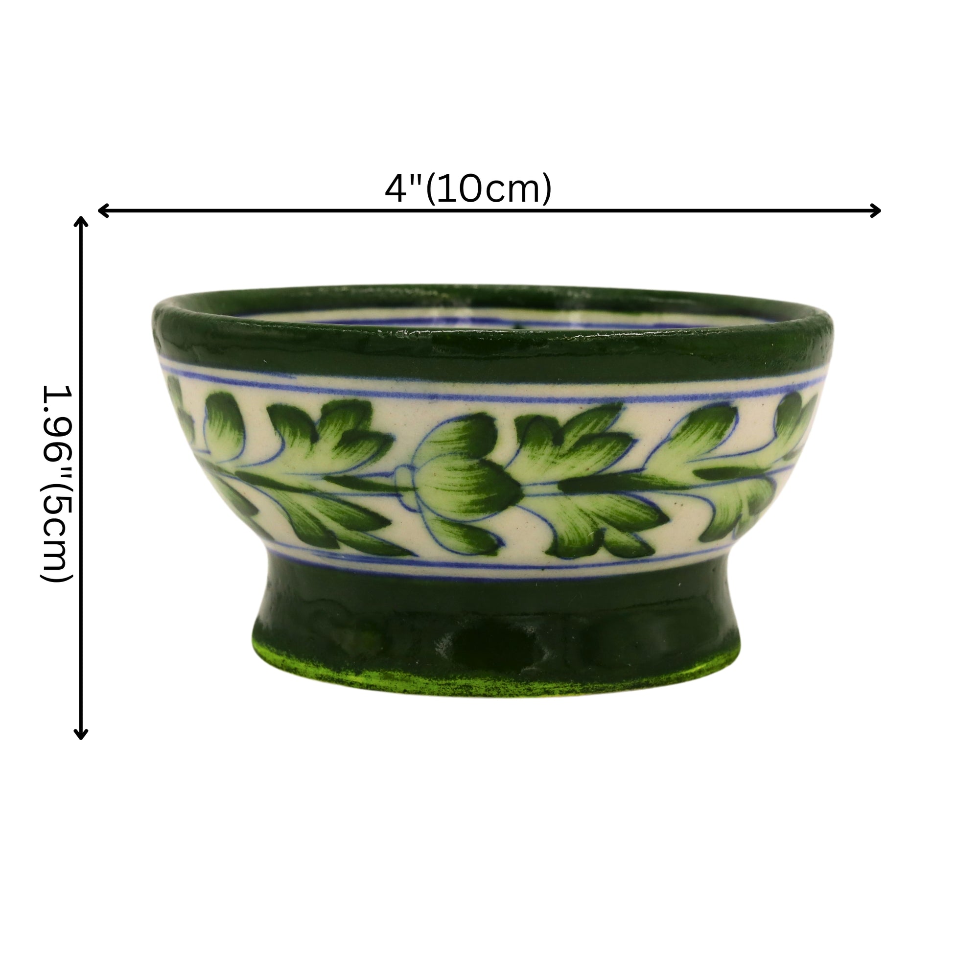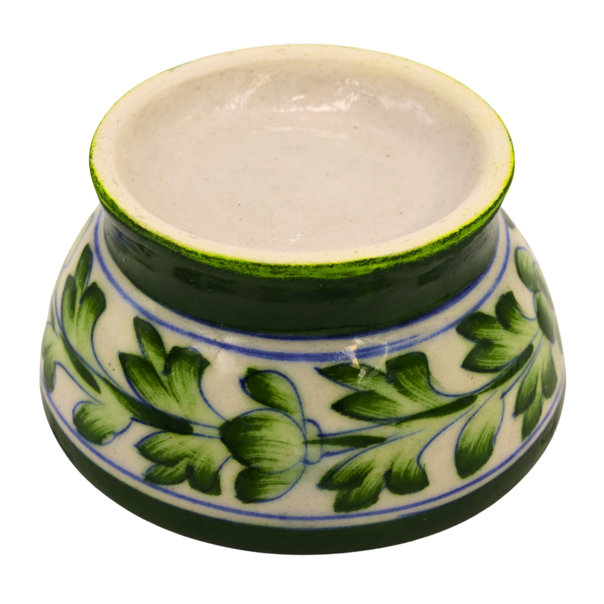 Round blue pottery bowl in white and green. Handcrafted in Jaipur. Traditional techniques. Ideal for serving or display.