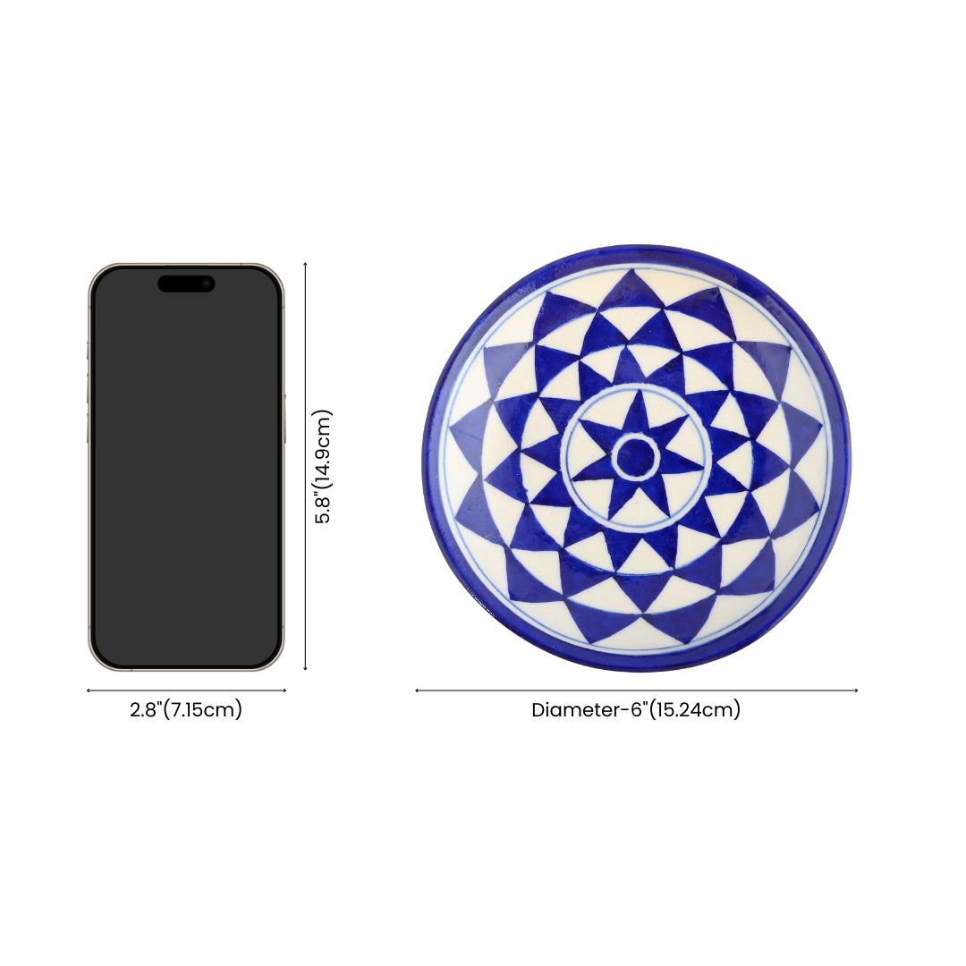 Journey through a mesmerising maze of triangles forming a spectacular star pattern. This handcrafted beauty showcases Jaipur's finest Blue Pottery craftsmanship. The intricate geometric design creates an optical illusion that captivates every viewer. Transform your space with this traditional treasure!
