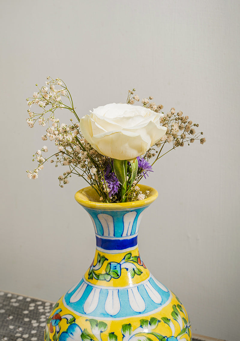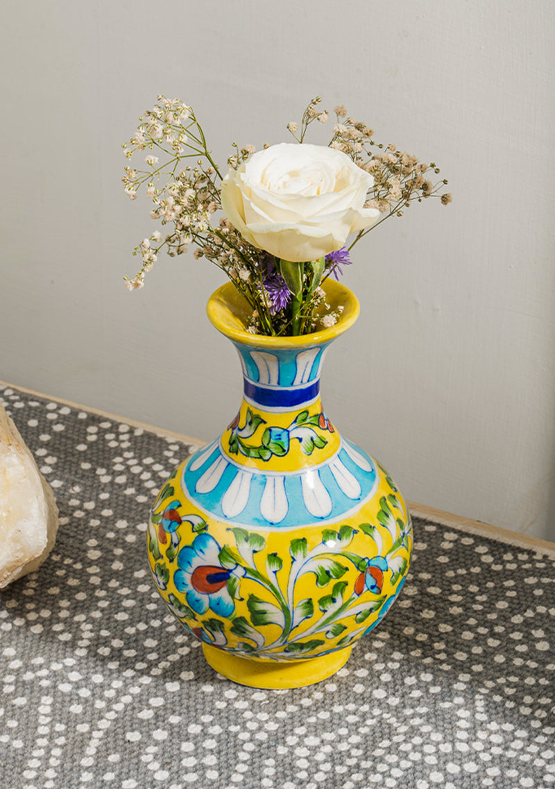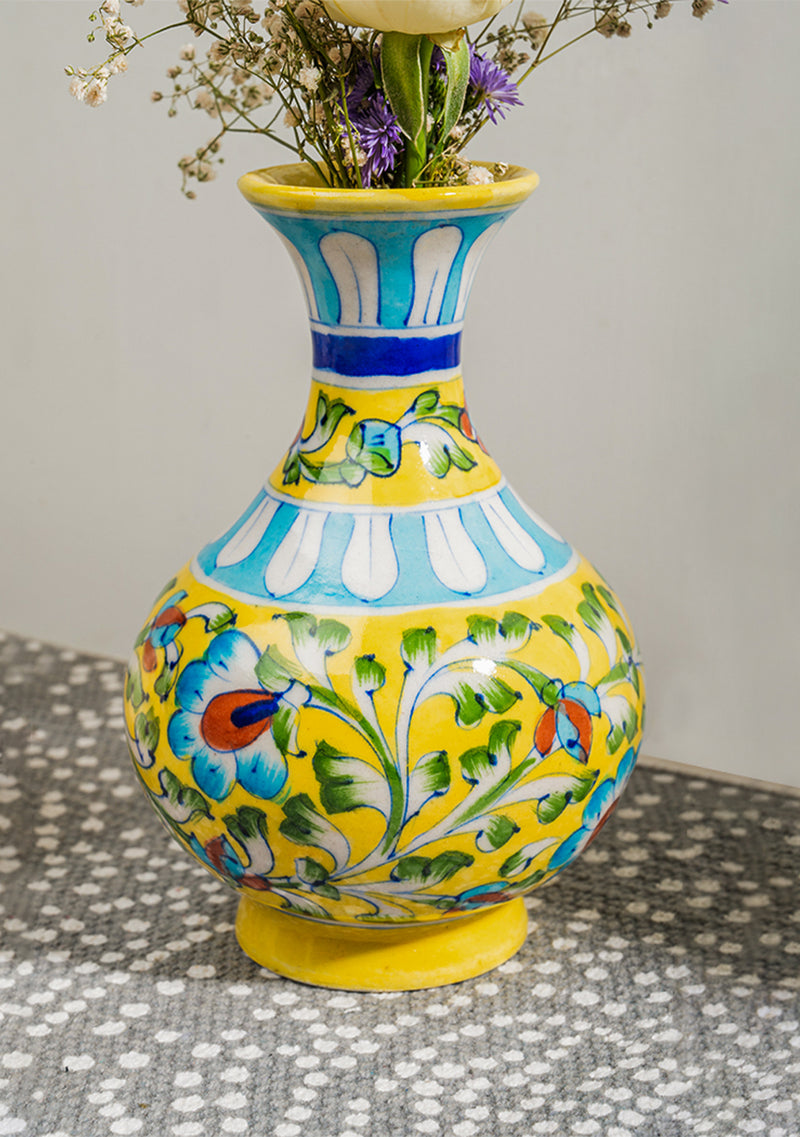 This handcrafted Blue Pottery Yellow Genie Vase is a delight to add to your home! Known for its striking motifs in bright colours and floral patterns, Blue Pottery is a vibrant feature for your home. This vase effortlessly becomes a show stealer in any room. Bring it home for a burst of joy or gift it with love to those you cherish.