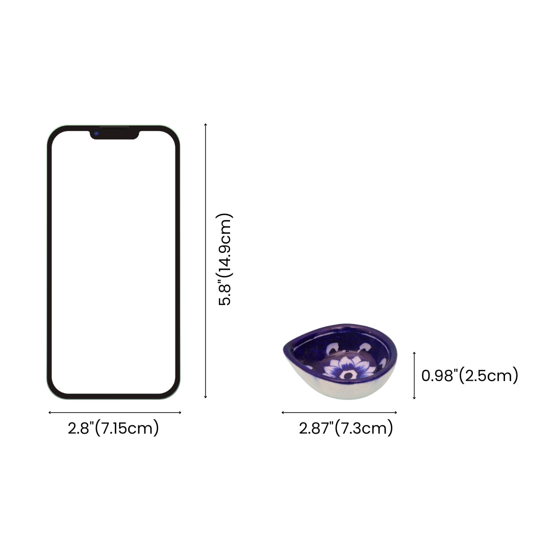 This diyas set features a leaf design in classic blue. Each piece is shaped by hand, painted with natural mineral-based colours, and fired at high temperature. Lead-free and perfect for festivals and home décor.