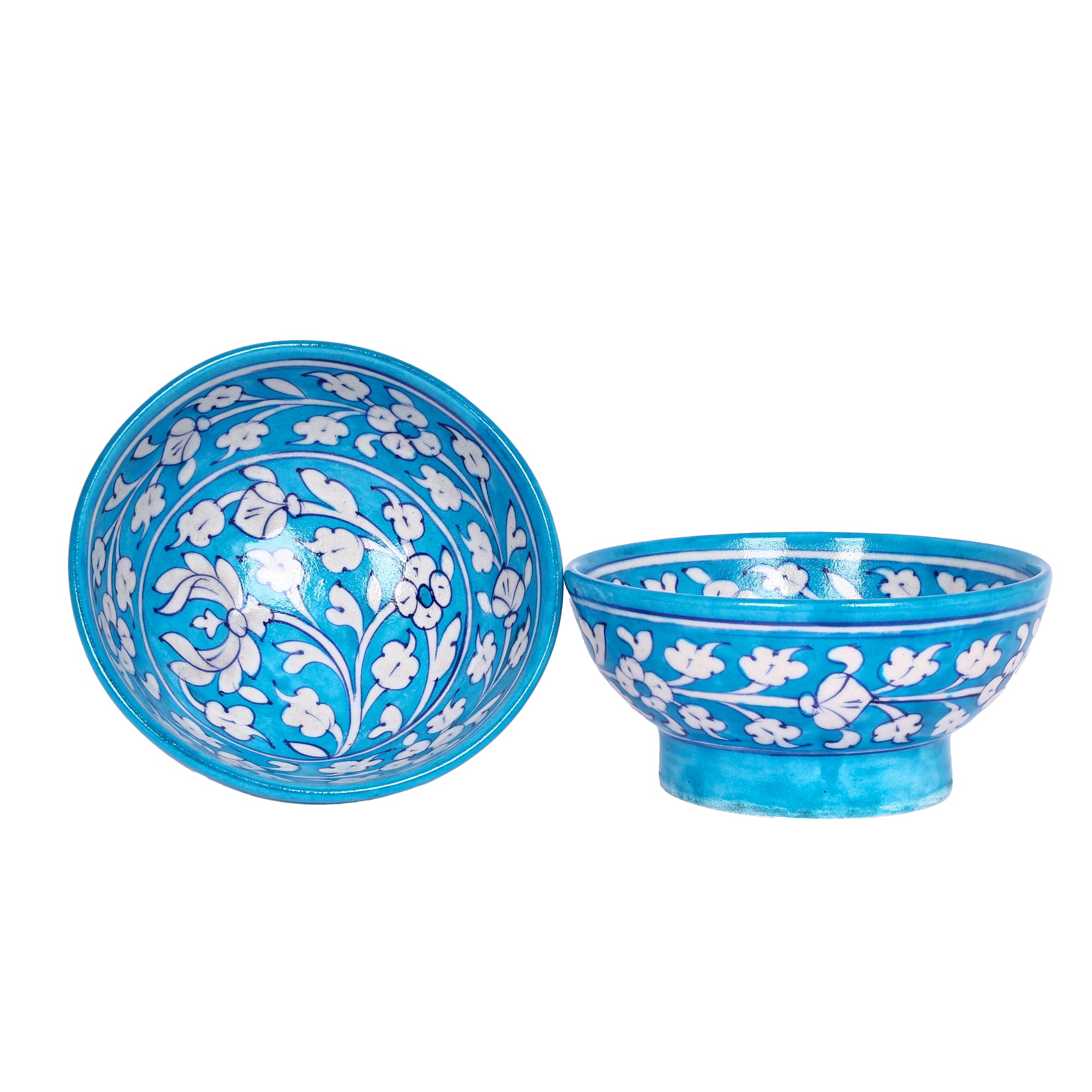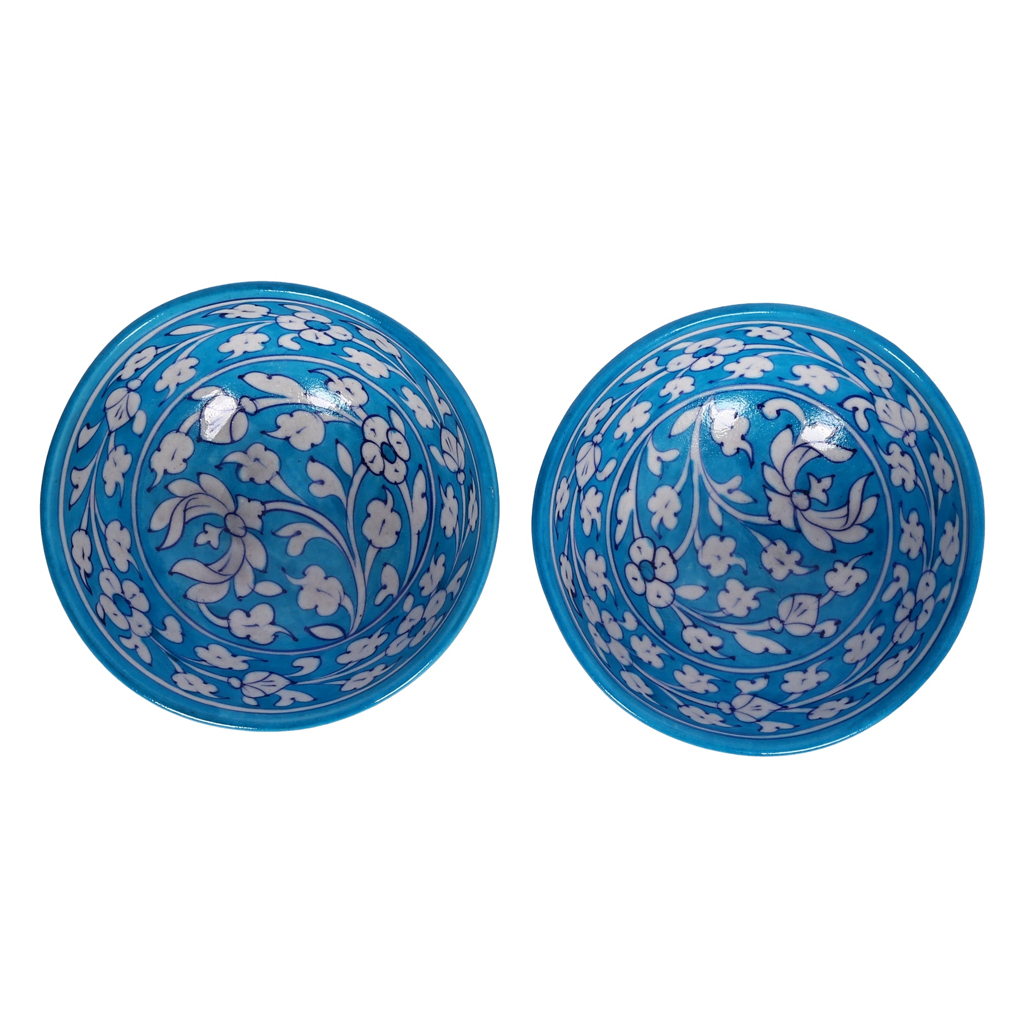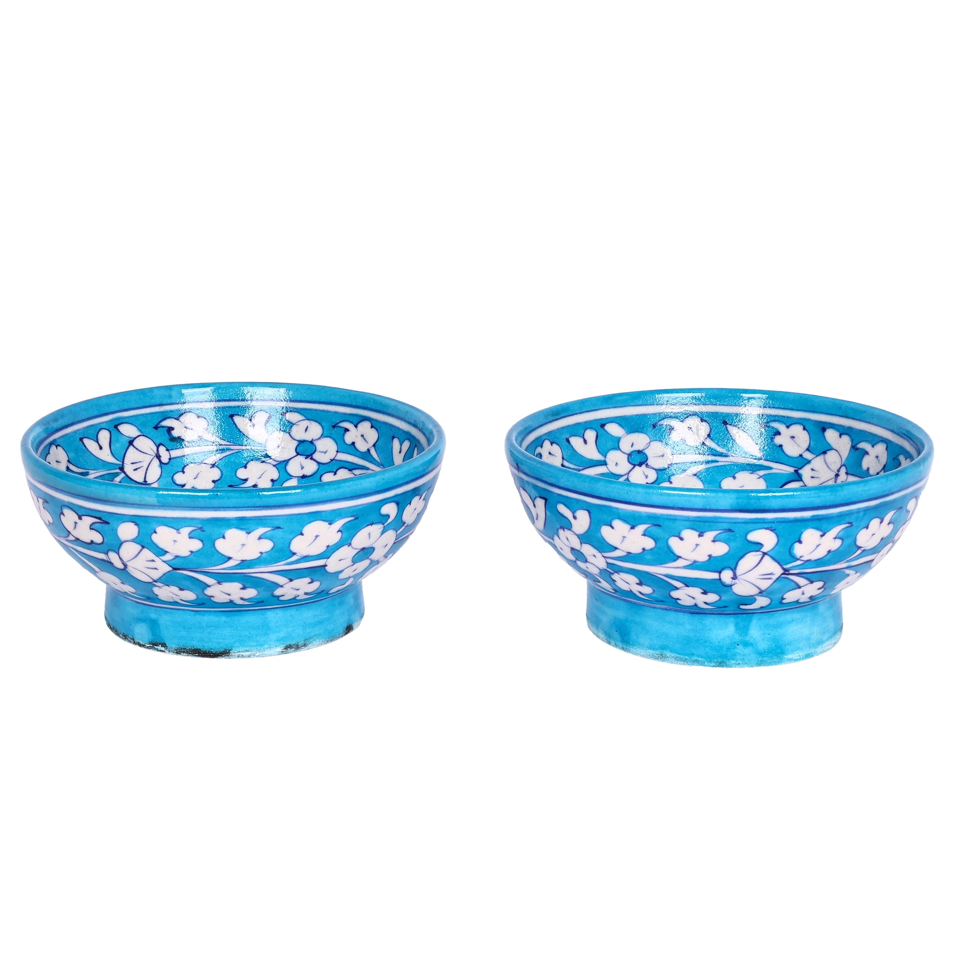Bask in the beauty of these cyan blue bowls, hand-painted with intricate floral motifs. A true work of art from Jaipur, this GI-tagged Blue Pottery set is a testament to skilled craftsmanship. Whether serving snacks or adding a cultural touch to your home, these bowls exude warmth and tradition.