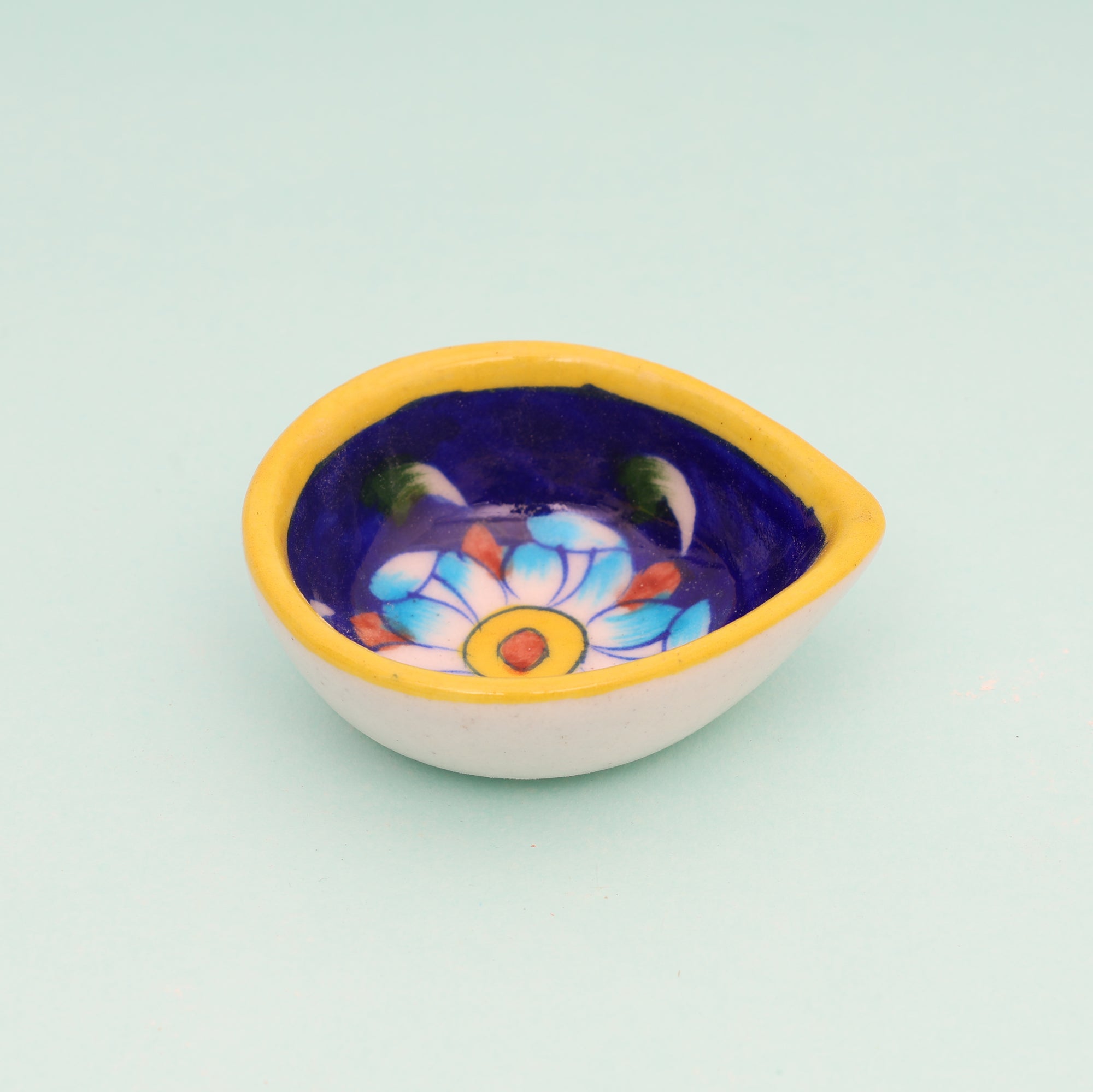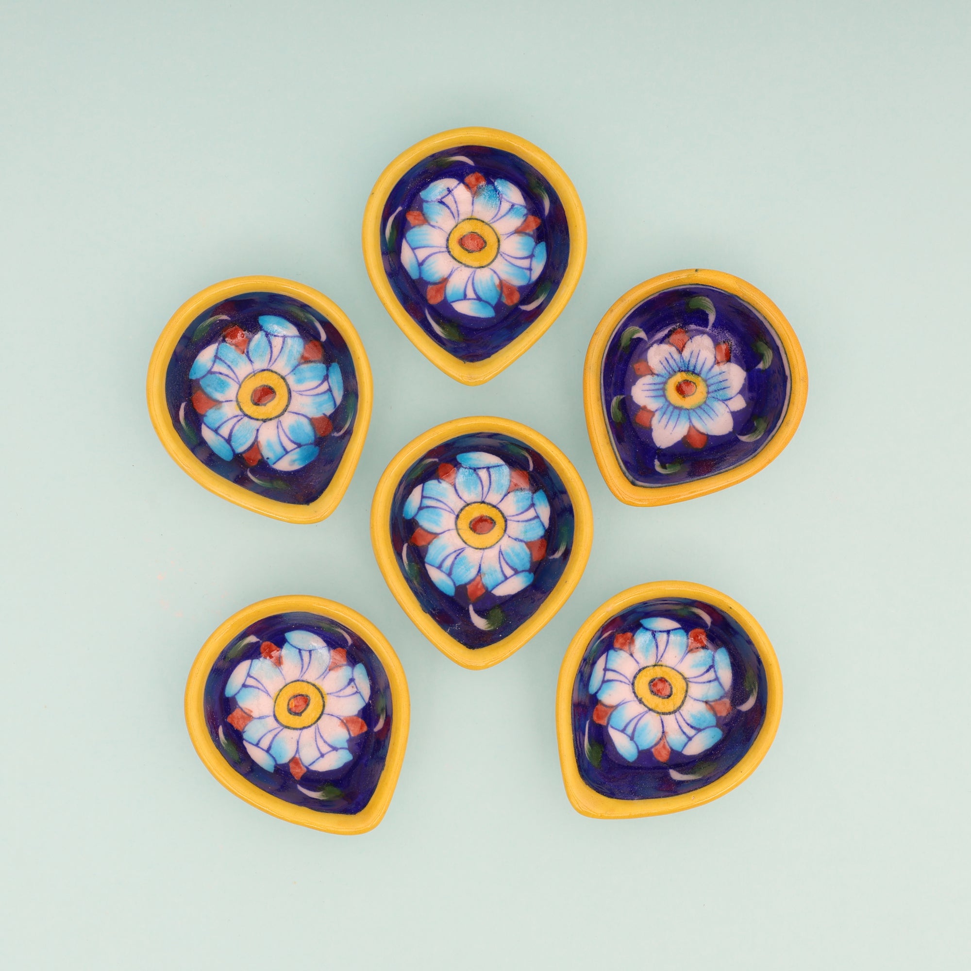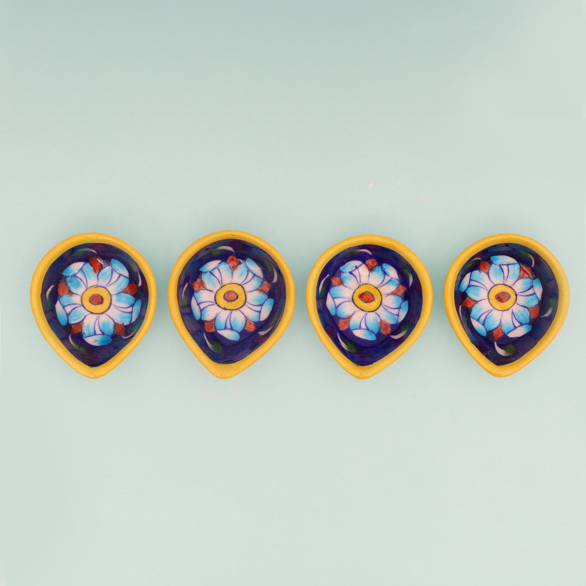 Illuminate your festivities with these Dual-Tone Blue Pottery Diyas, featuring a glossy navy blue interior contrasted with a bright yellow rim. Each diya is hand-painted with a striking floral motif in white, blue, and red, making them stand out as both functional and decorative pieces.