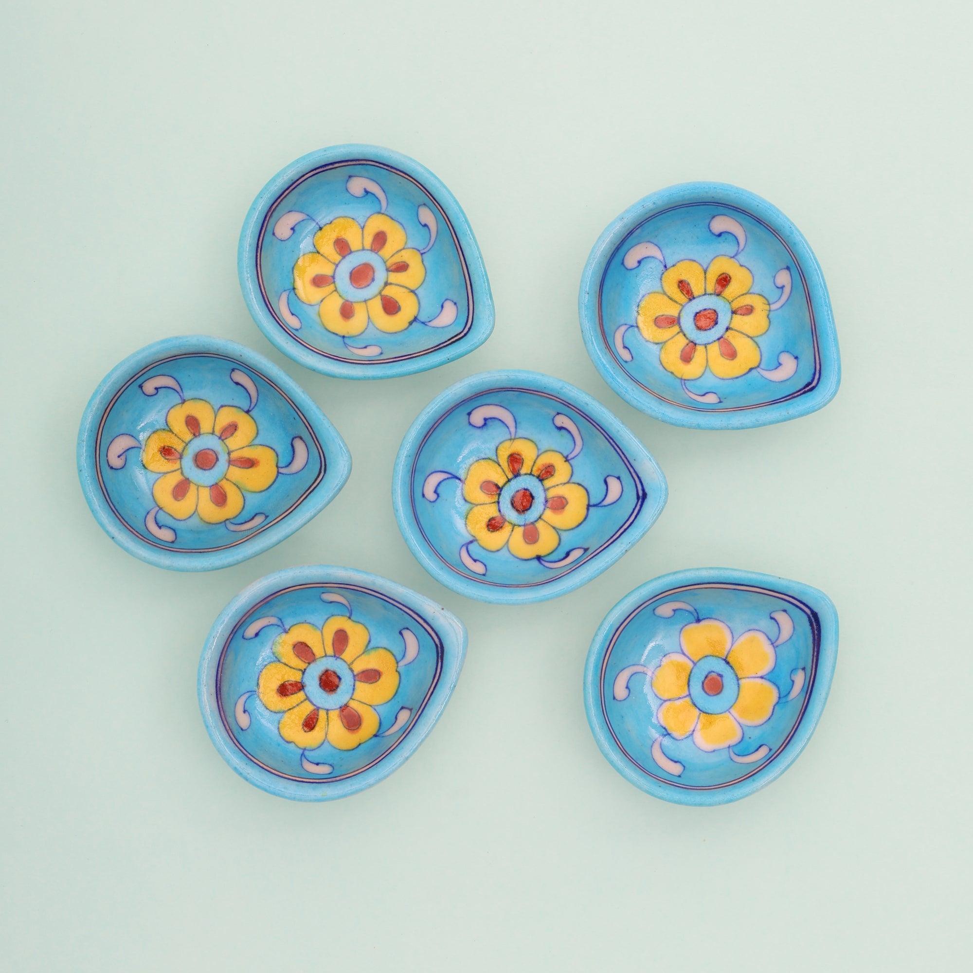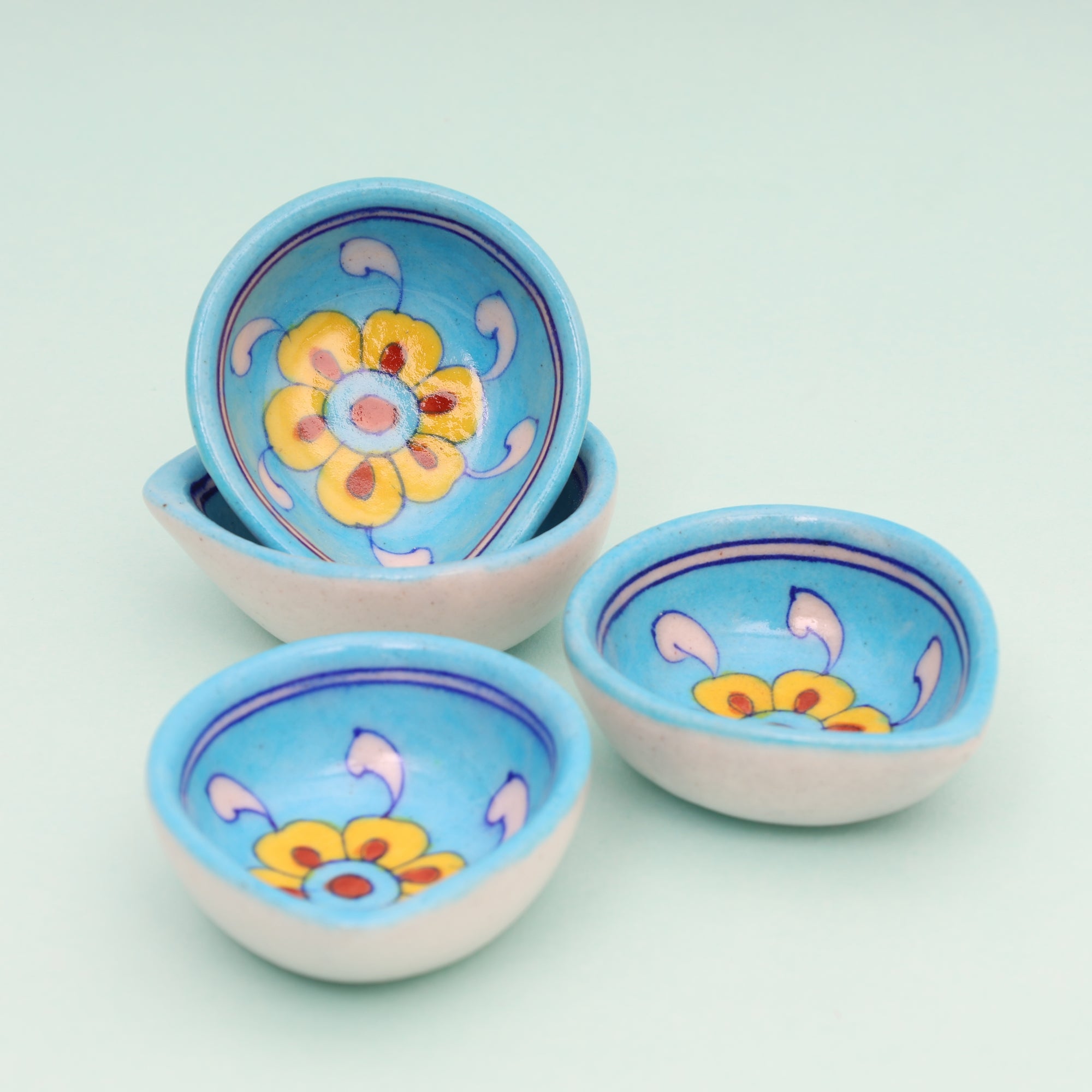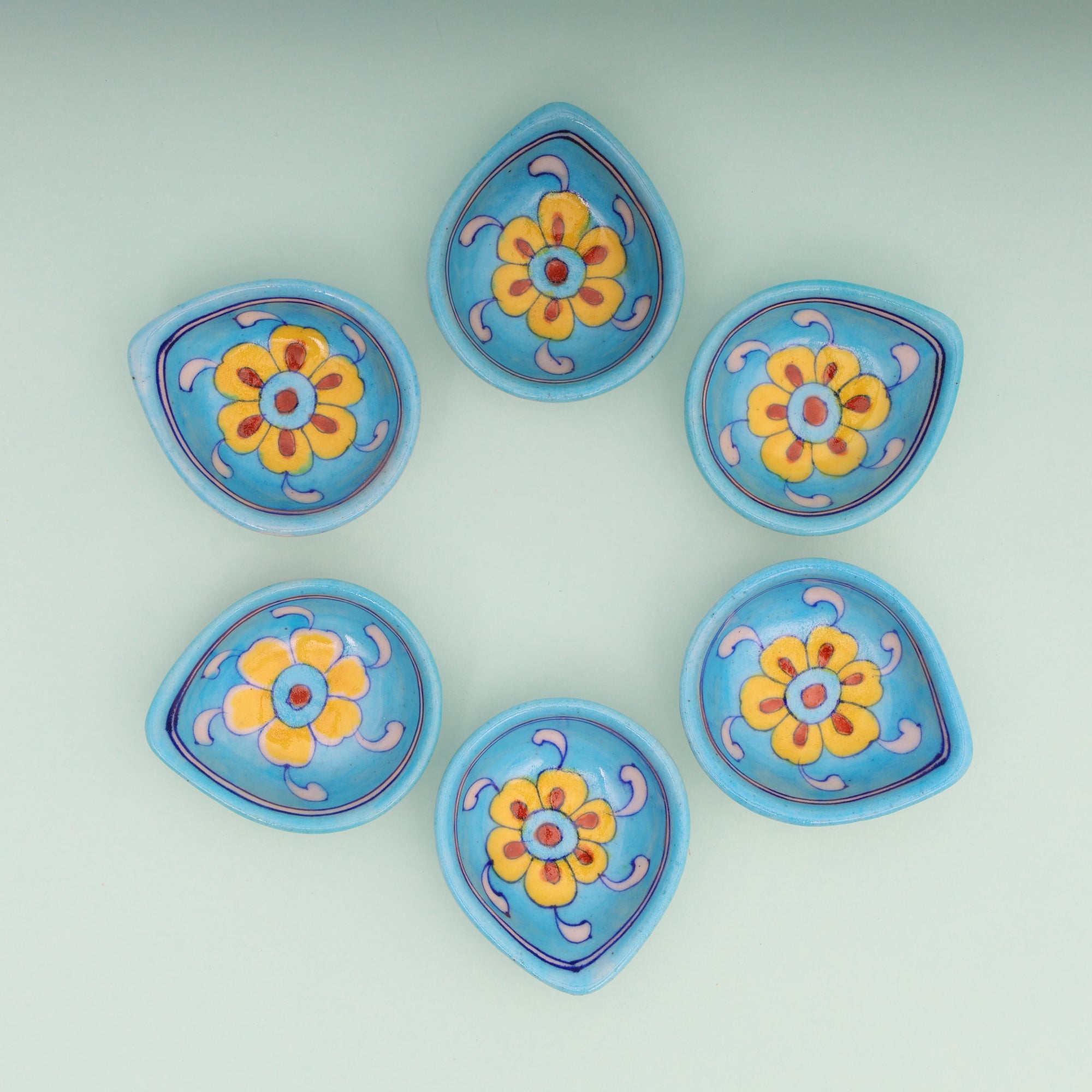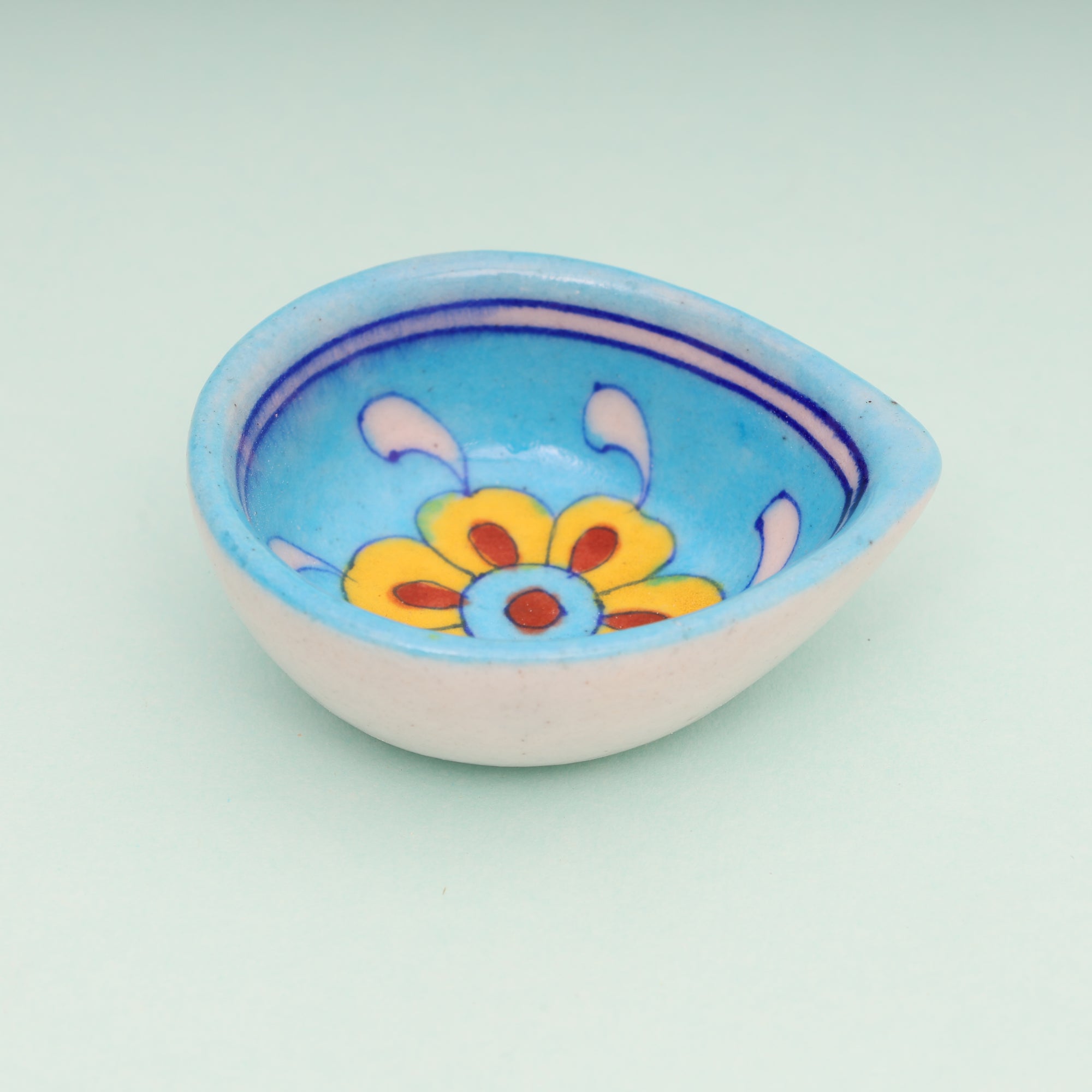 Elegant light blue leaf-shaped diyas, handcrafted in our Jaipur workshop. Traditional blue pottery, lead-free and perfect for gifting or home use.