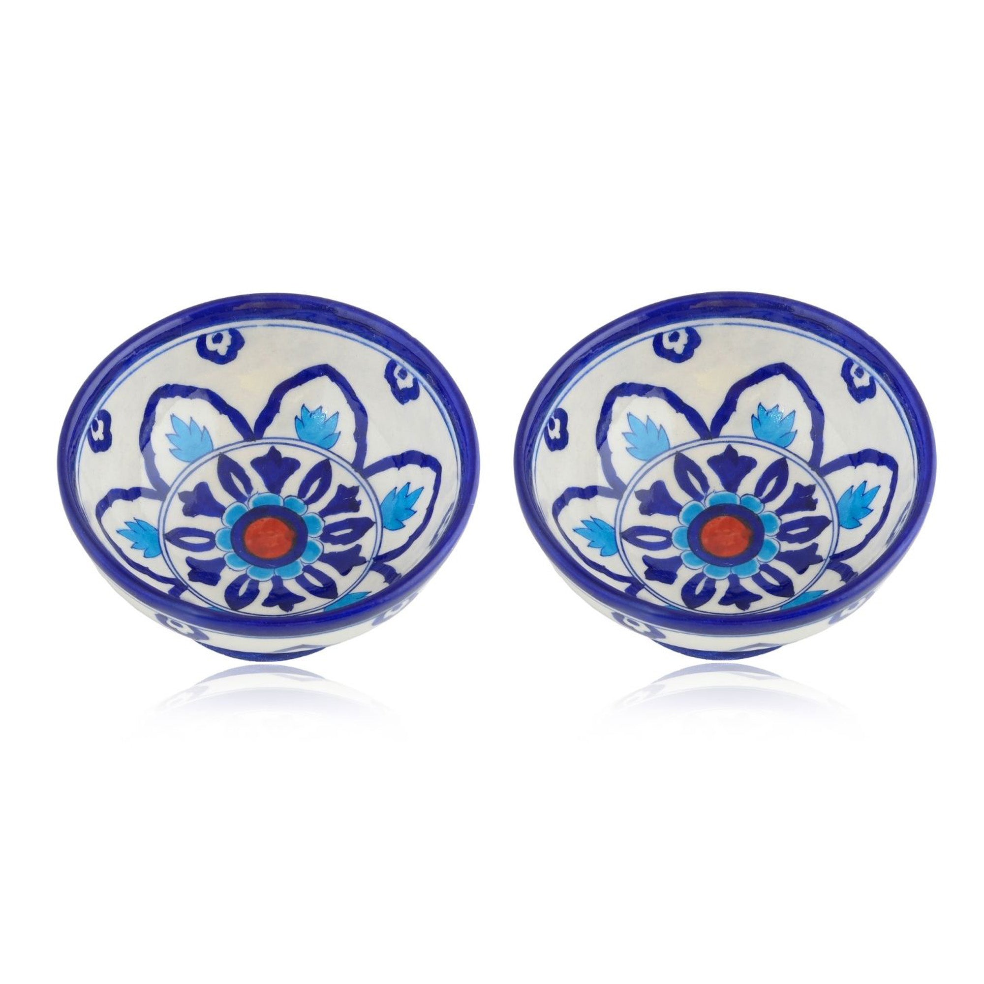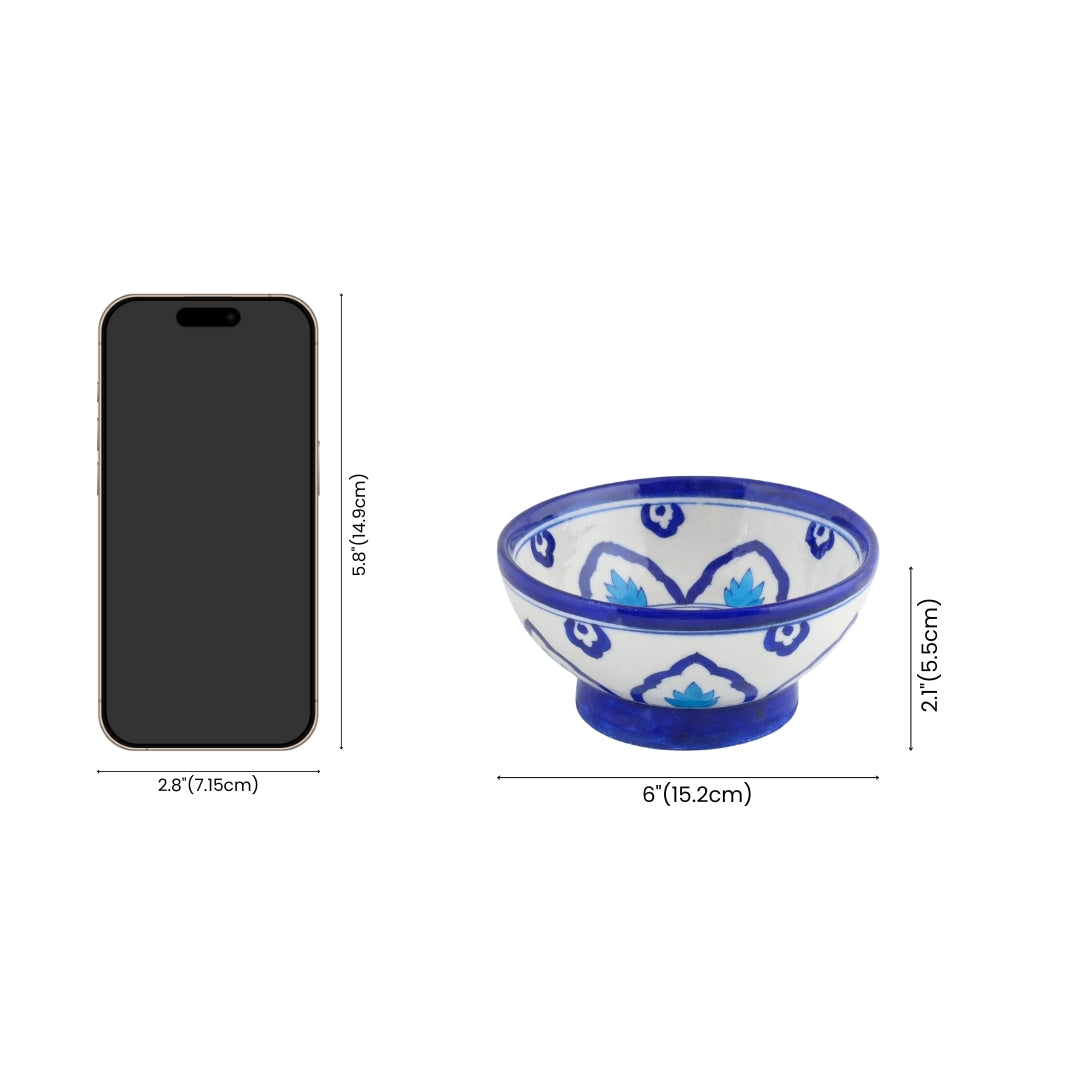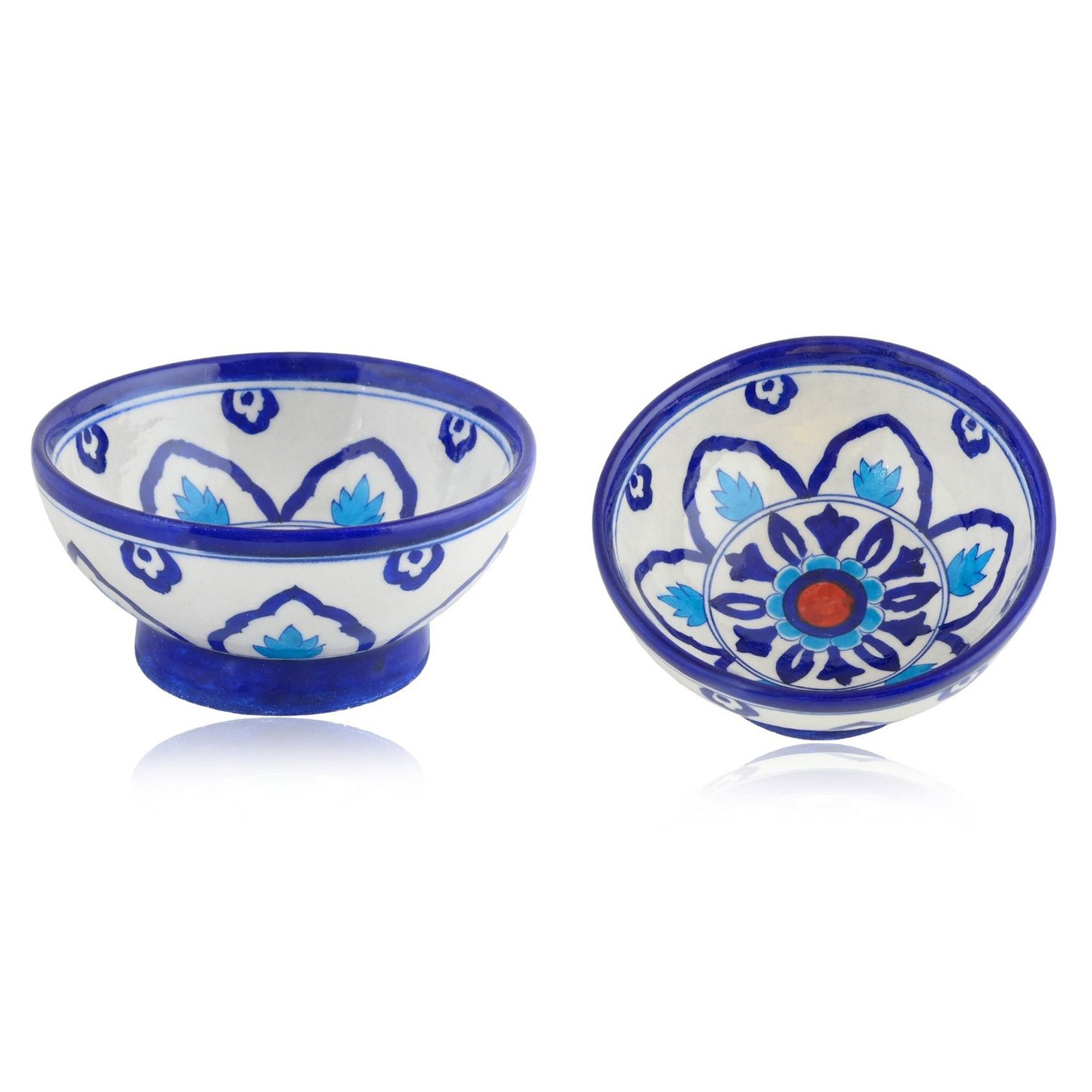 Blue Pottery Art—Handcrafted and hand-painted by skilled artisans. Set of 2 blue floral pattern bowls—6 inches. Ideal for kitchen décor and home décor. Perfect and thoughtful gifting.
