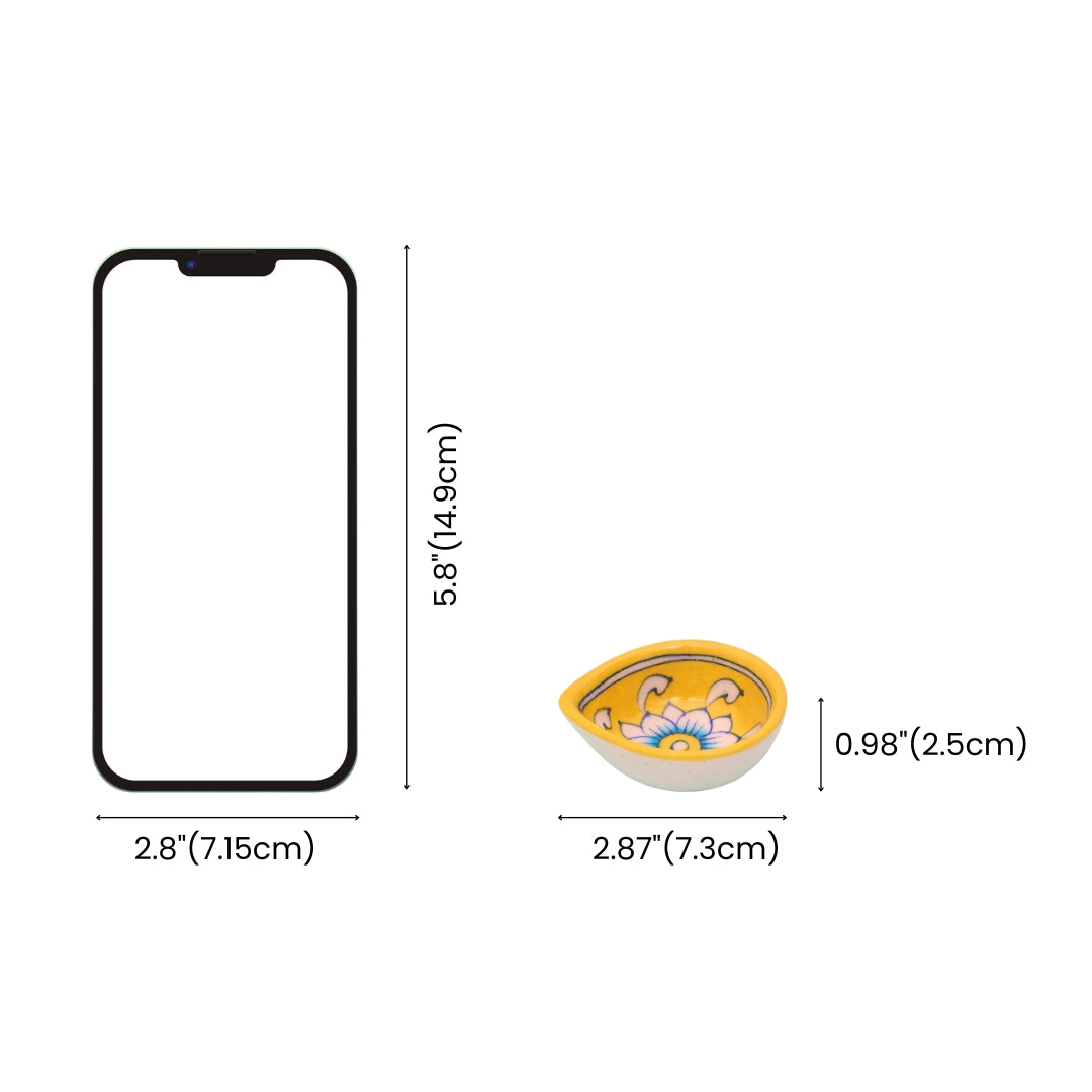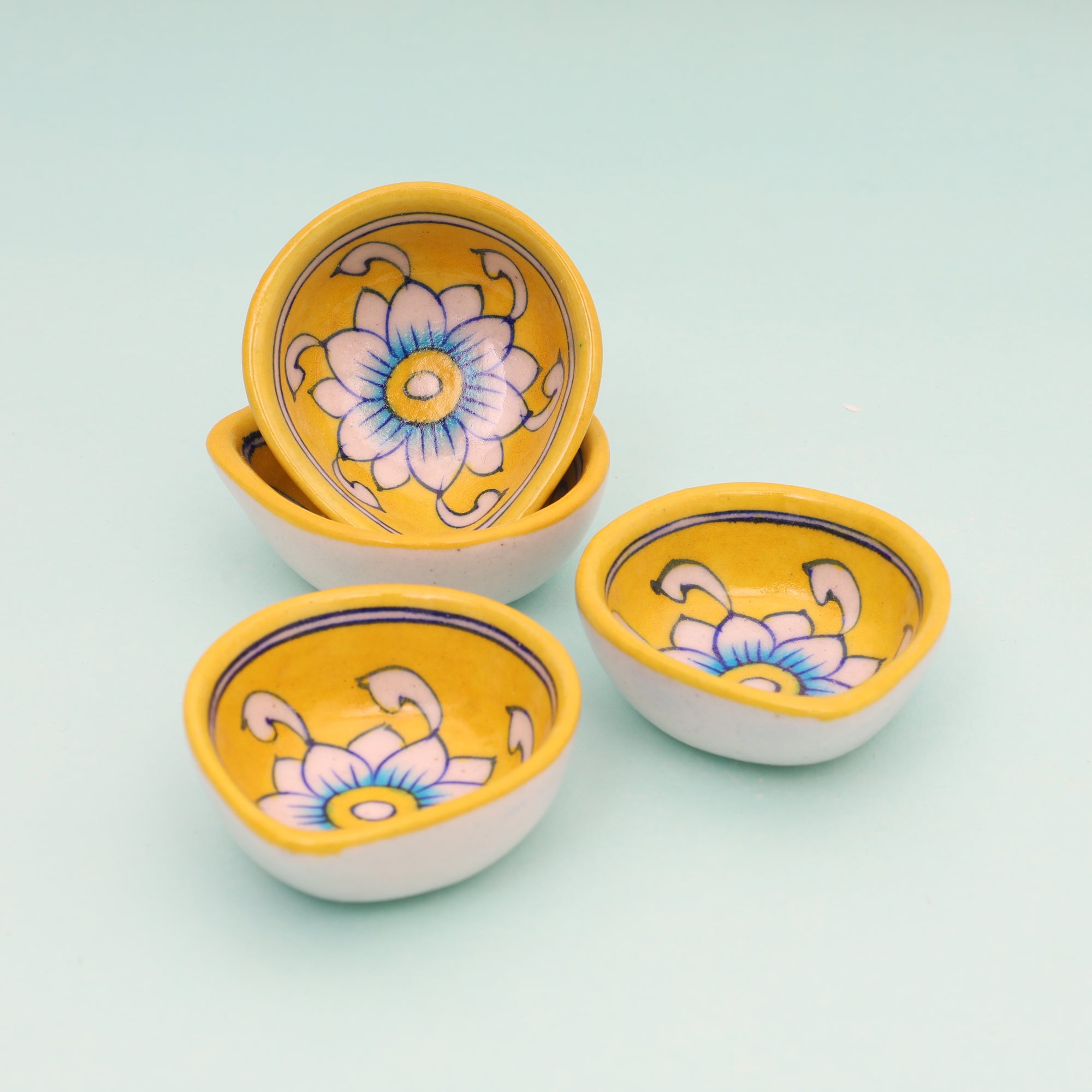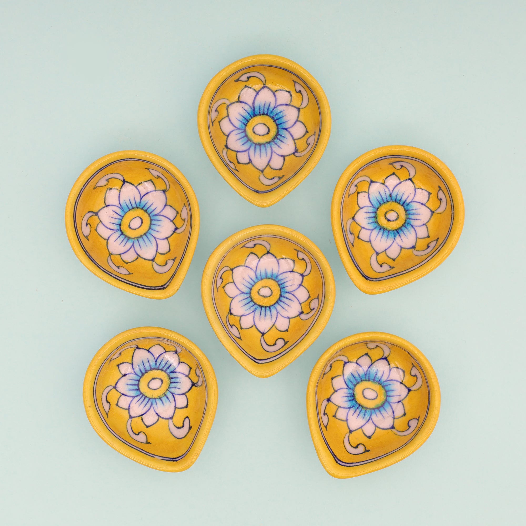 Cheerful yellow leaf-shaped diyas, handcrafted in Jaipur. Traditional blue pottery techniques. Perfect for festivals and home décor.