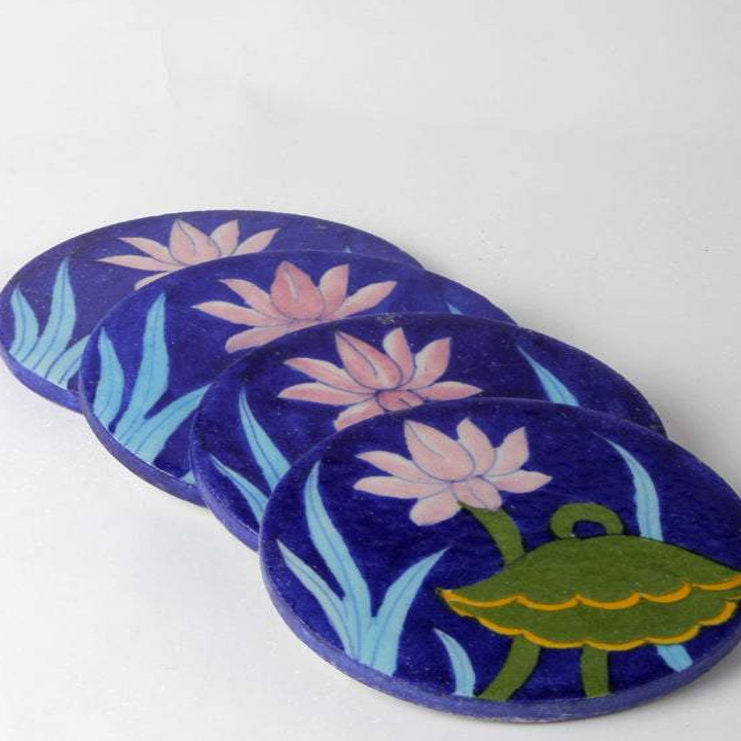 Handcrafted blue pottery coaster featuring elegant traditional floral design, perfect for protecting surfaces in style. Durable yet delicate, ideal for everyday use with cups and glasses—just wipe clean with a damp cloth.