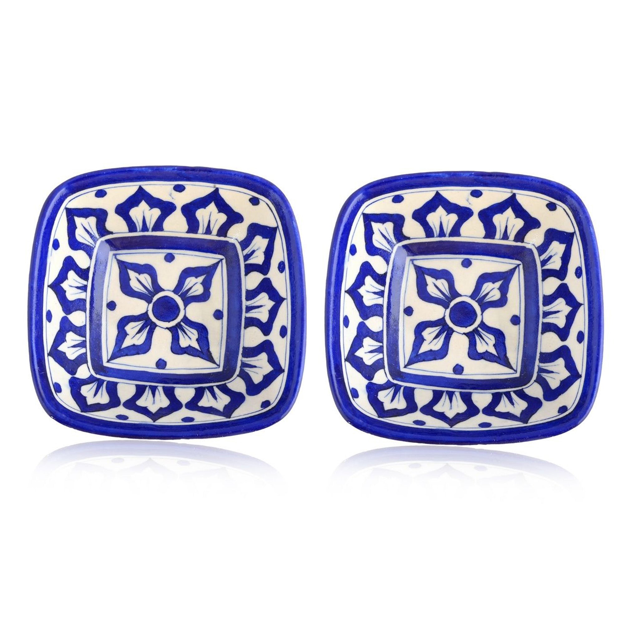 Set of two 6" blue pottery bowls with floral and geometric patterns in blue. Handcrafted in our Jaipur workshop.