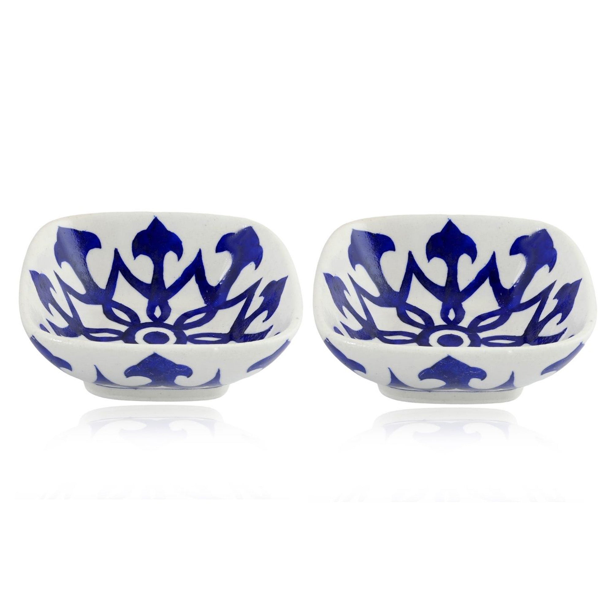 Set of two 6" blue pottery bowls with floral and geometric patterns in white. Handcrafted in Jaipur. Lead-free and durable.